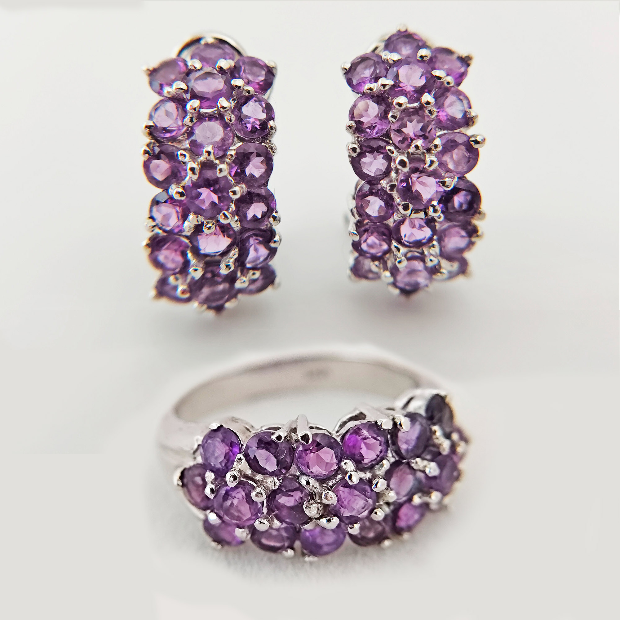 A set of 14K white gold amethyst earrings and ring set. It is marked 18K but only tested as 14K. Got this from a lady in Manila who bought them in Cambodia. It’s not vintage but a little over 20 years old. She has acquired a number of jewelry over the years and has decided to let go of some pieces. It’s been gently cleaned and in good condition.