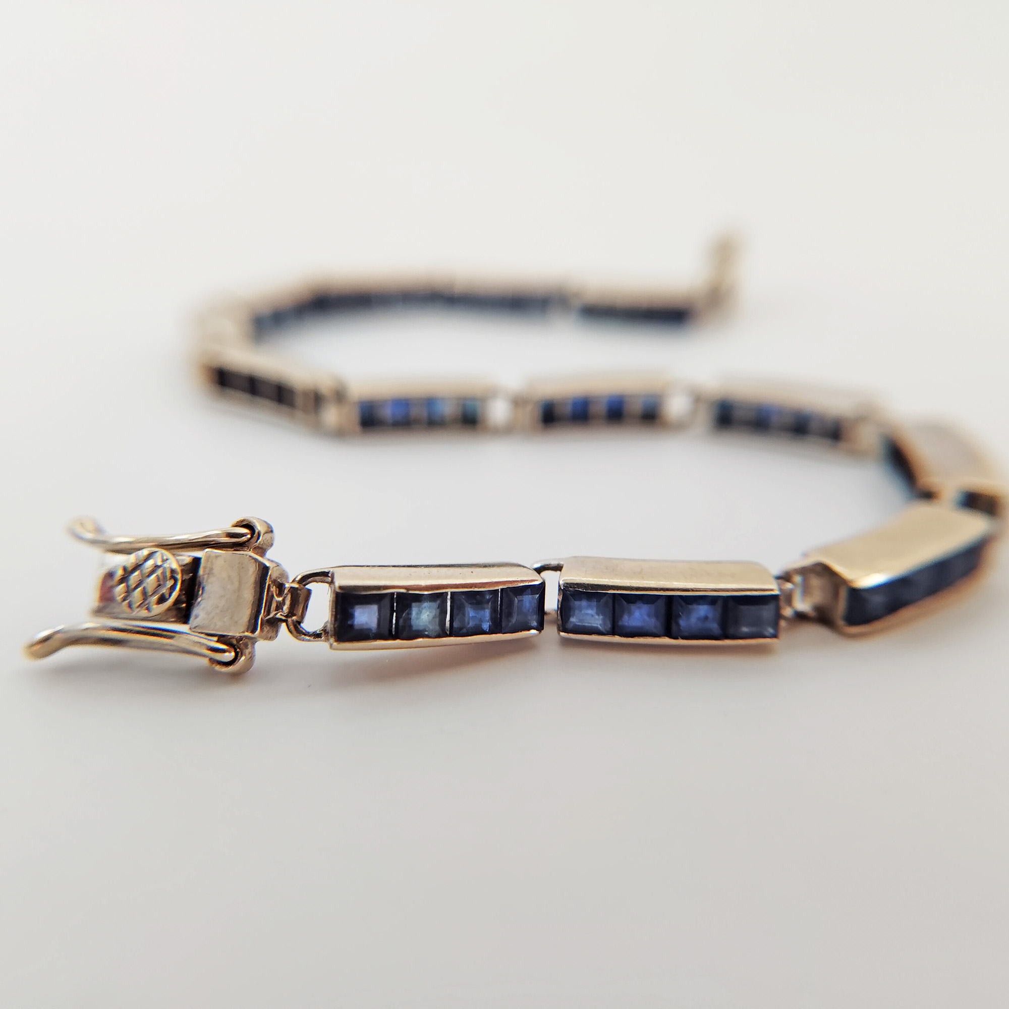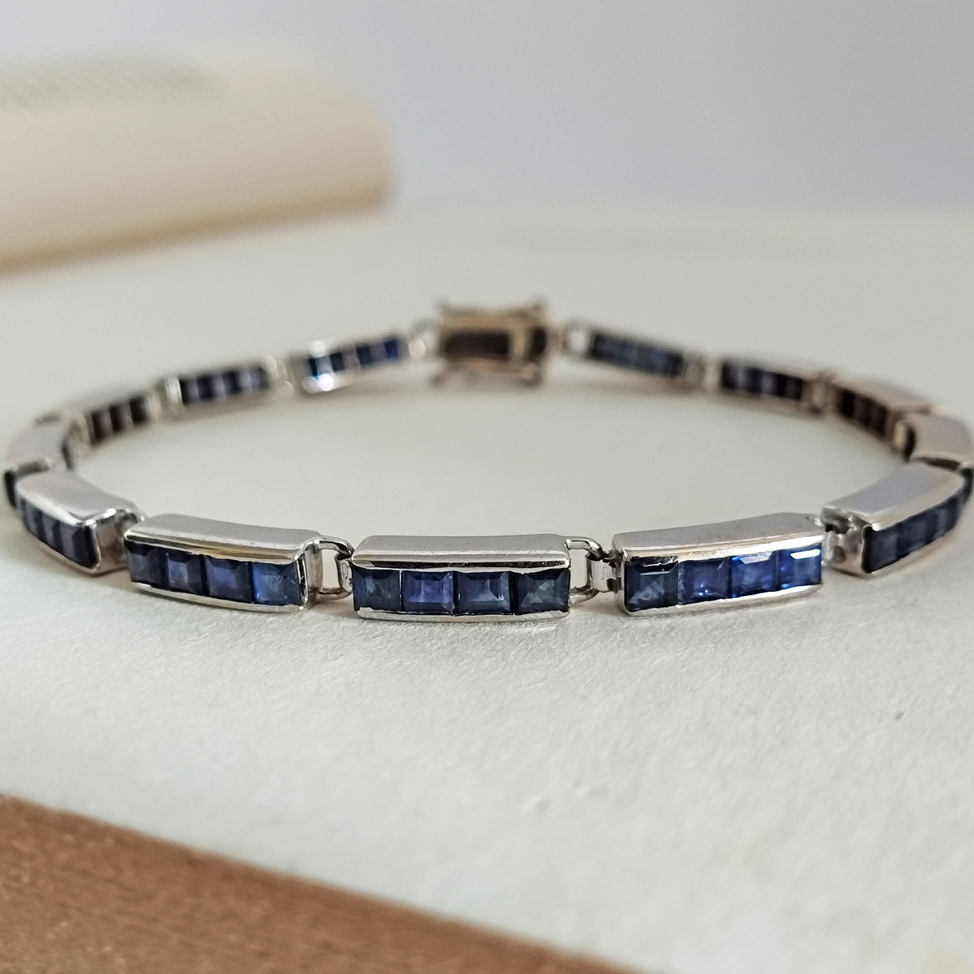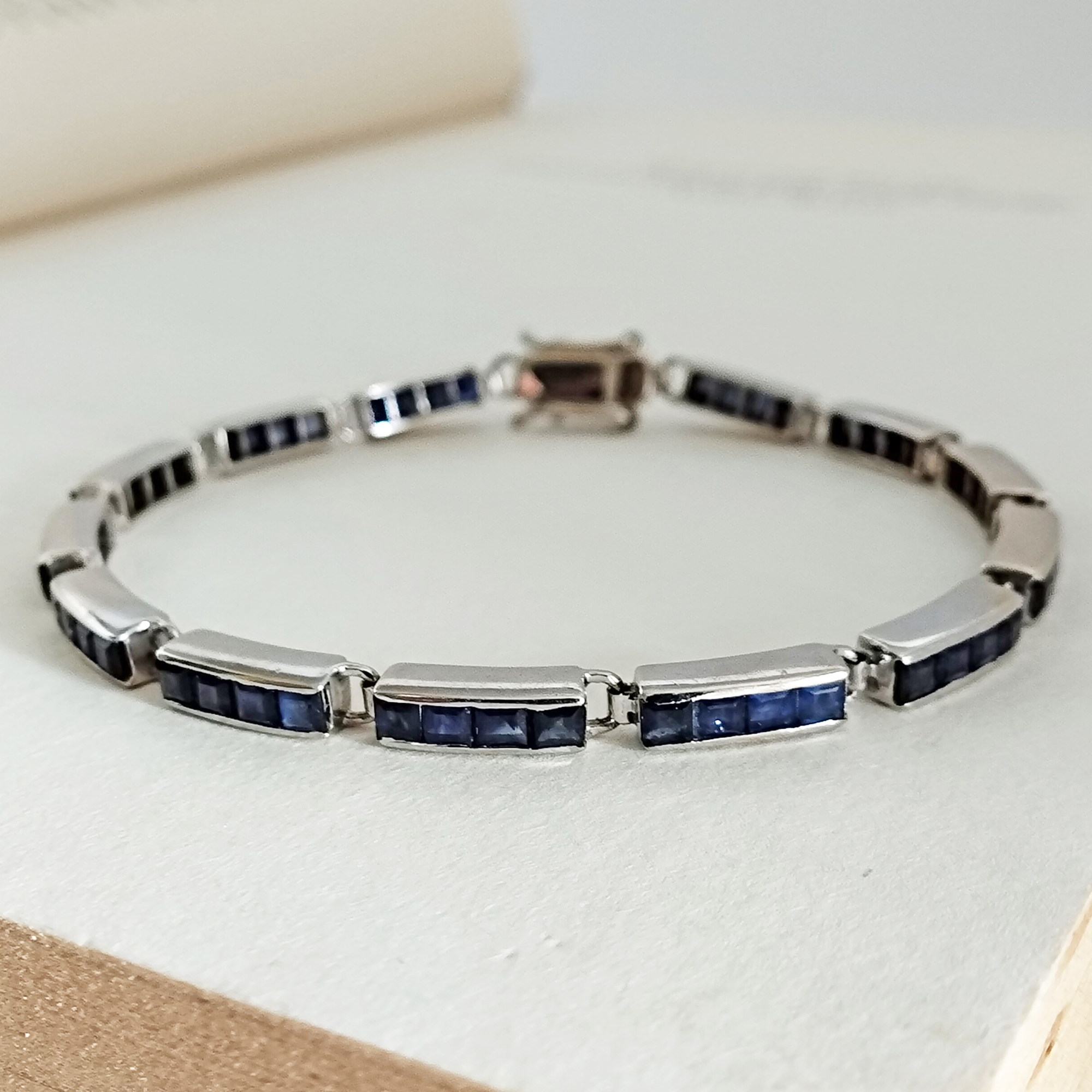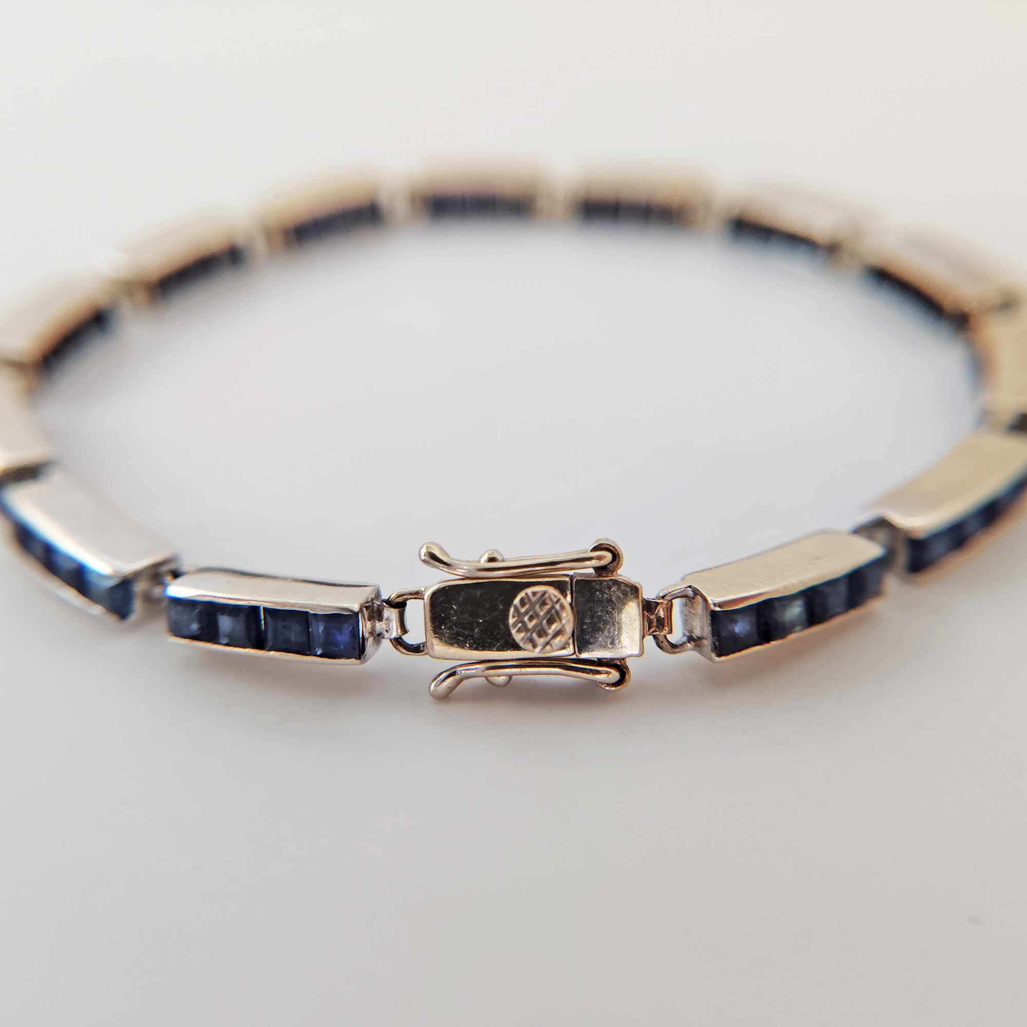 A 14K white gold blue sapphire bracelet. It has 52 pieces princess cut blue sapphires. Got this from a lady in Manila who bought them in Cambodia. It’s not vintage but a little over 20 years old. She acquired a lot of jewelry over the years and has decided to let go of some pieces. It’s been gently cleaned and in good condition.