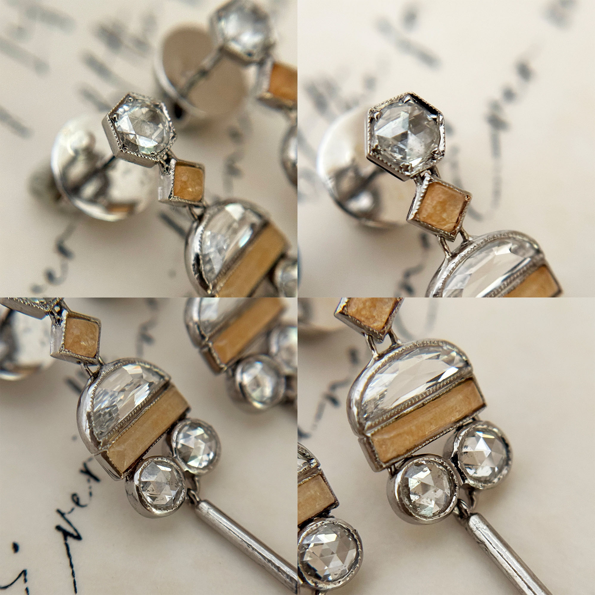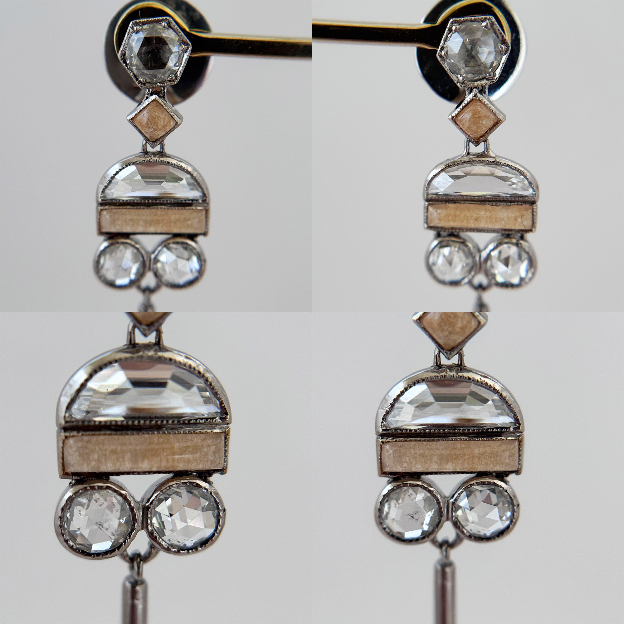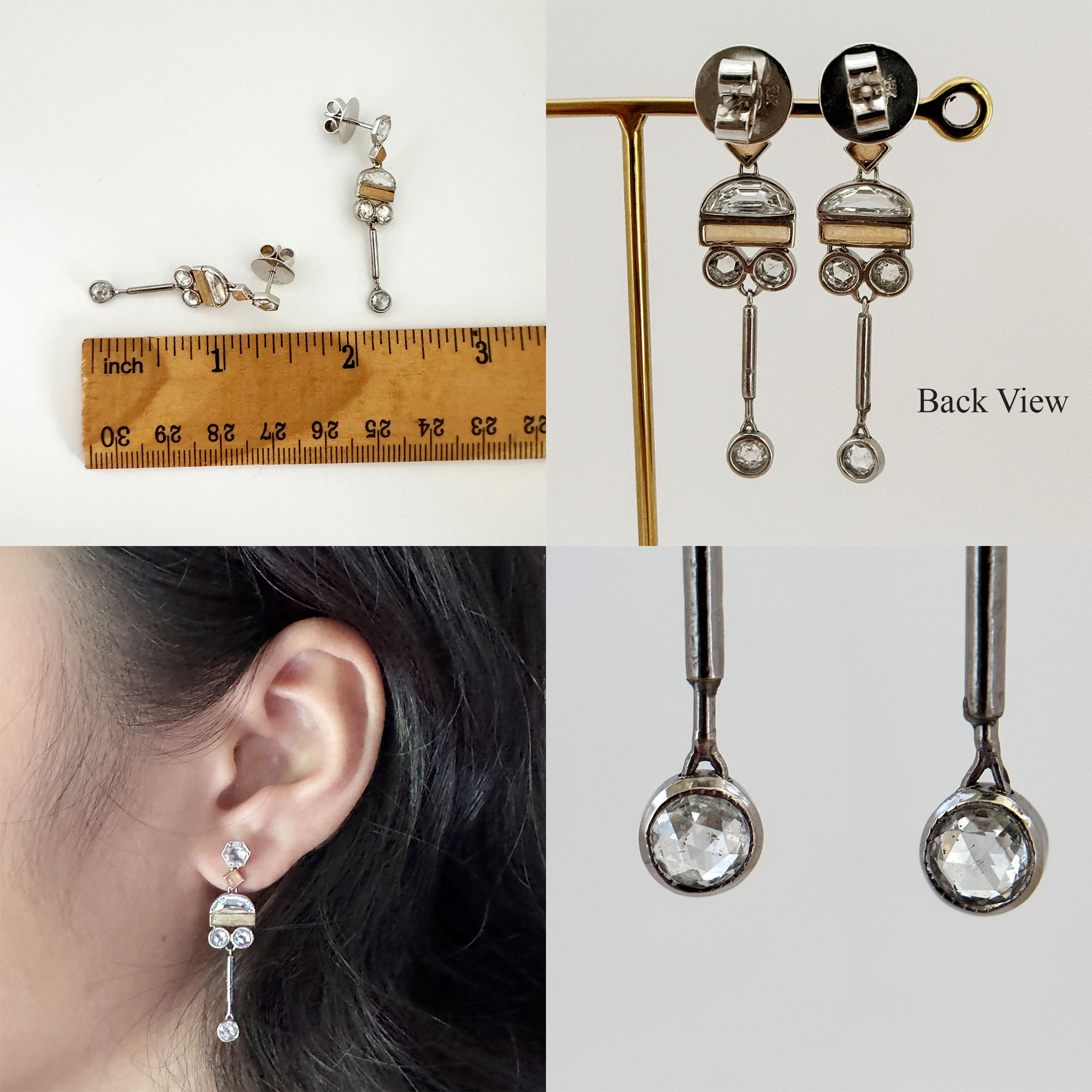 There are also 8 pieces of rose cut diamonds in 0.15ct each with very minimal inclusions. Jasper in cream color add an interesting touch to the earrings. The locks are marked “18K”. These did not originate in the Philippines. They have been gently cleaned and in good vintage condition.