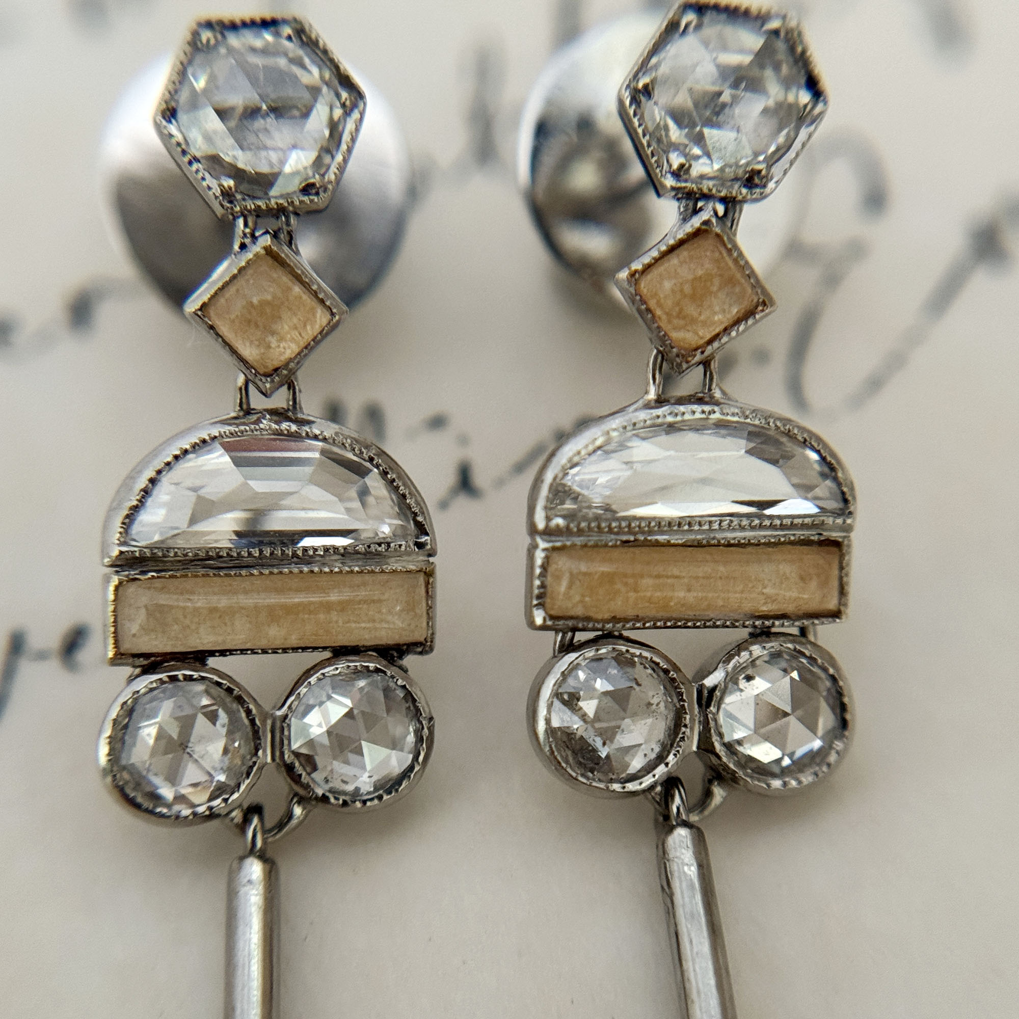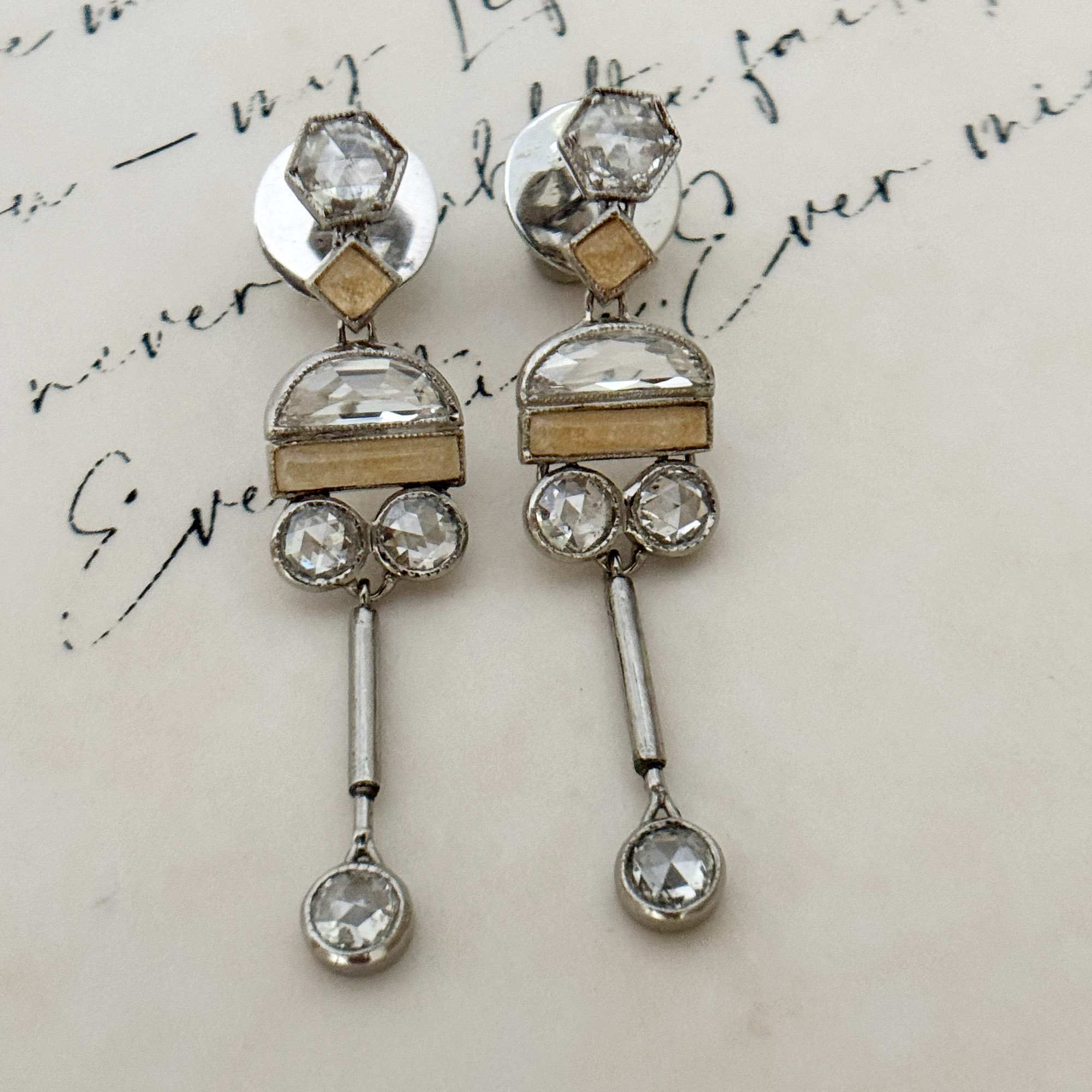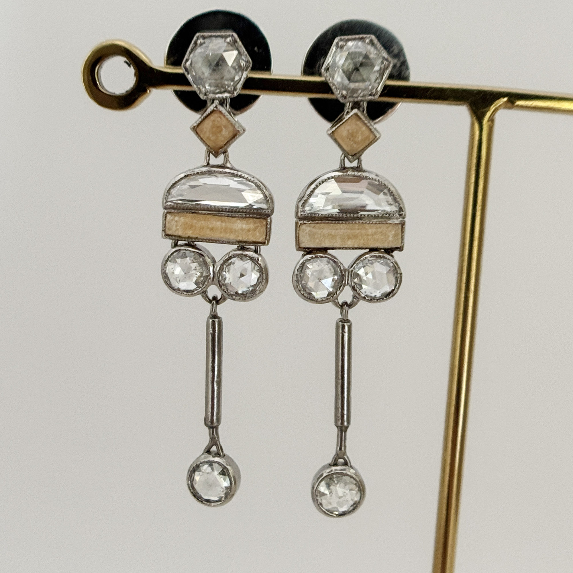 There are also 8 pieces of rose cut diamonds in 0.15ct each with very minimal inclusions. Jasper in cream color add an interesting touch to the earrings. The locks are marked “18K”. These did not originate in the Philippines. They have been gently cleaned and in good vintage condition.