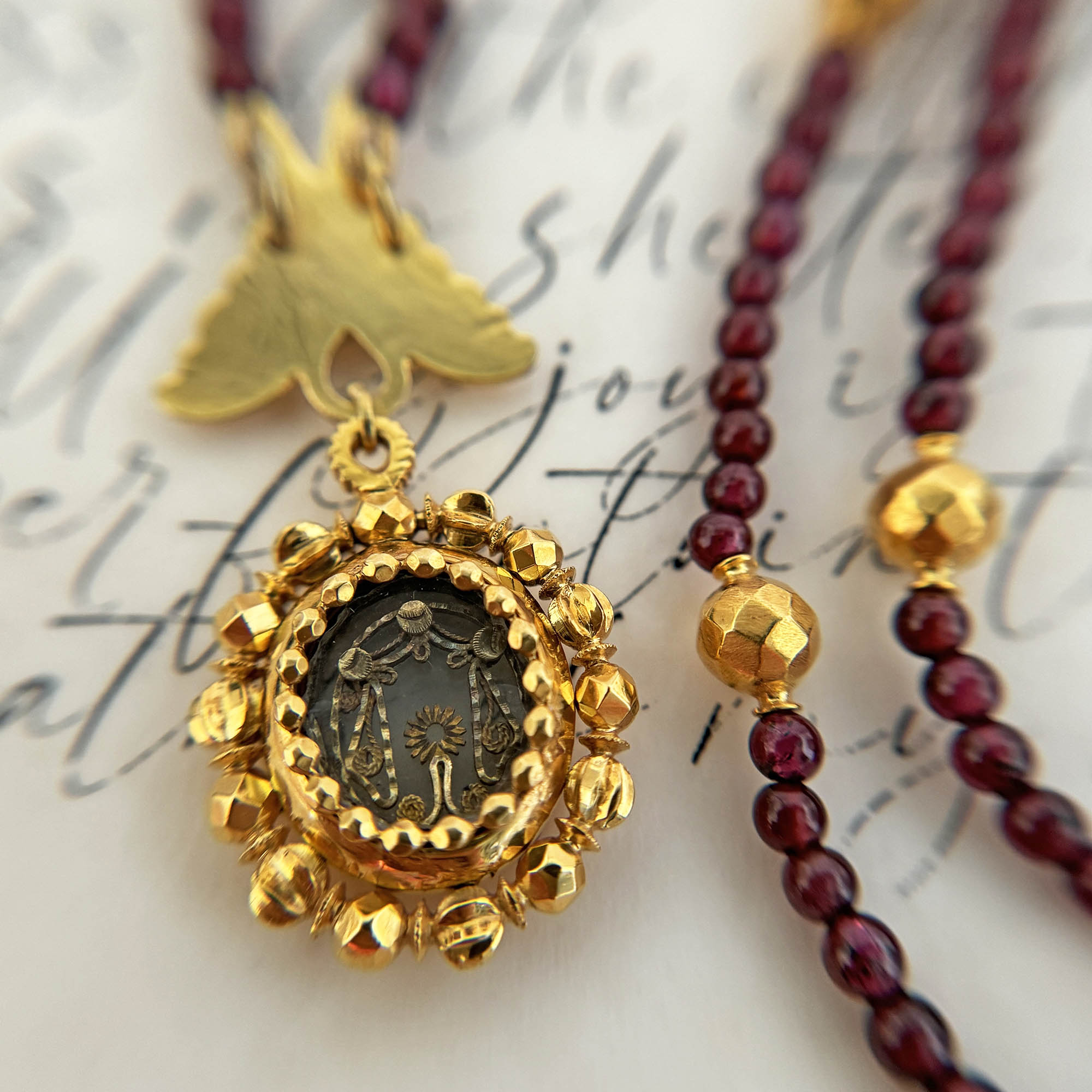 A tamburin necklace from the Philippines. It features a small antique 10K gold relicario, paired with vintage 8K gold mariposa (or butterfly connector) and vintage 10K gold tamburin beads. They did not originally go together and we added new garnet beads. The relicario shows a lovely monstrance design. Like all our tamburin necklaces, we string them on silk thread and finish with french wires to give it a more polished look.