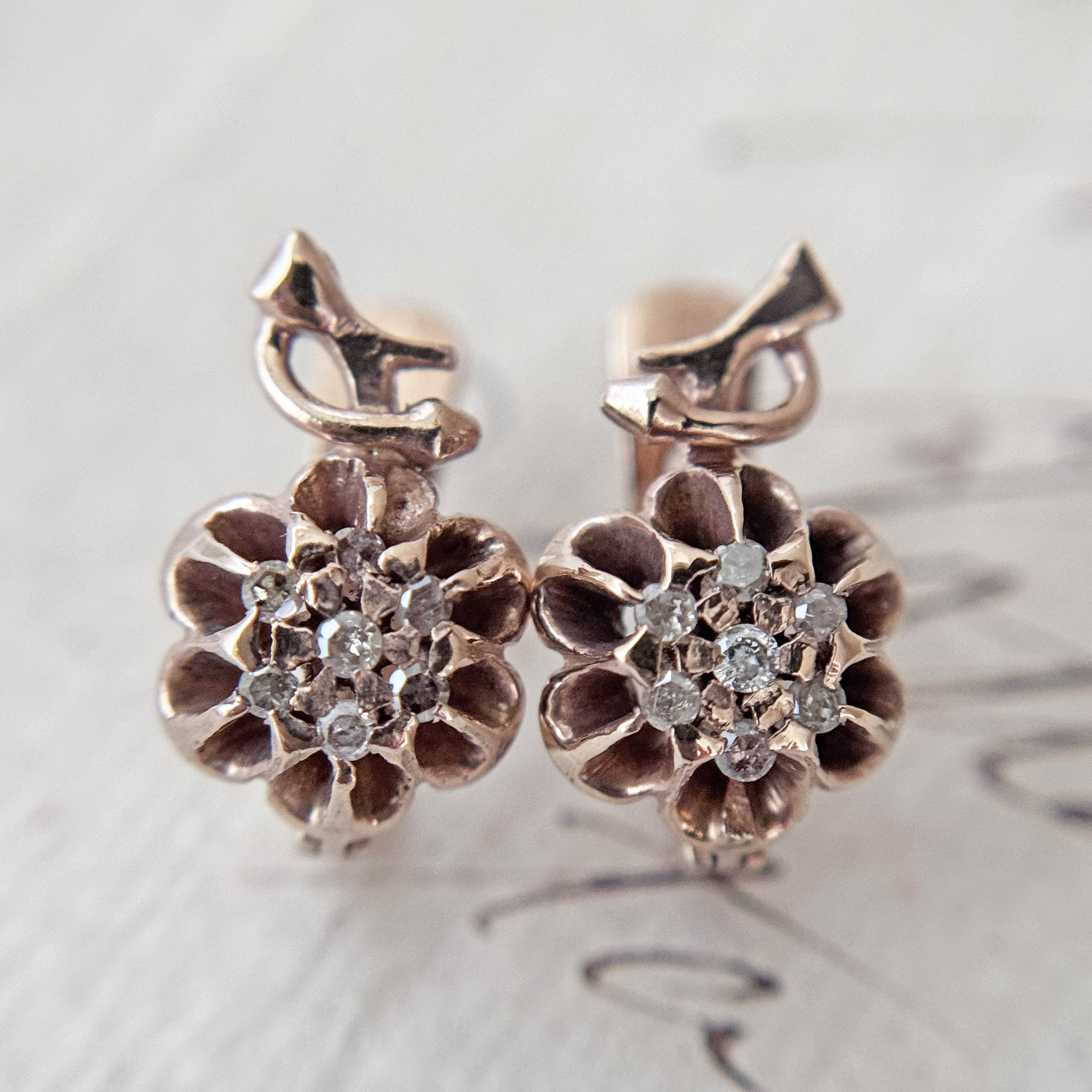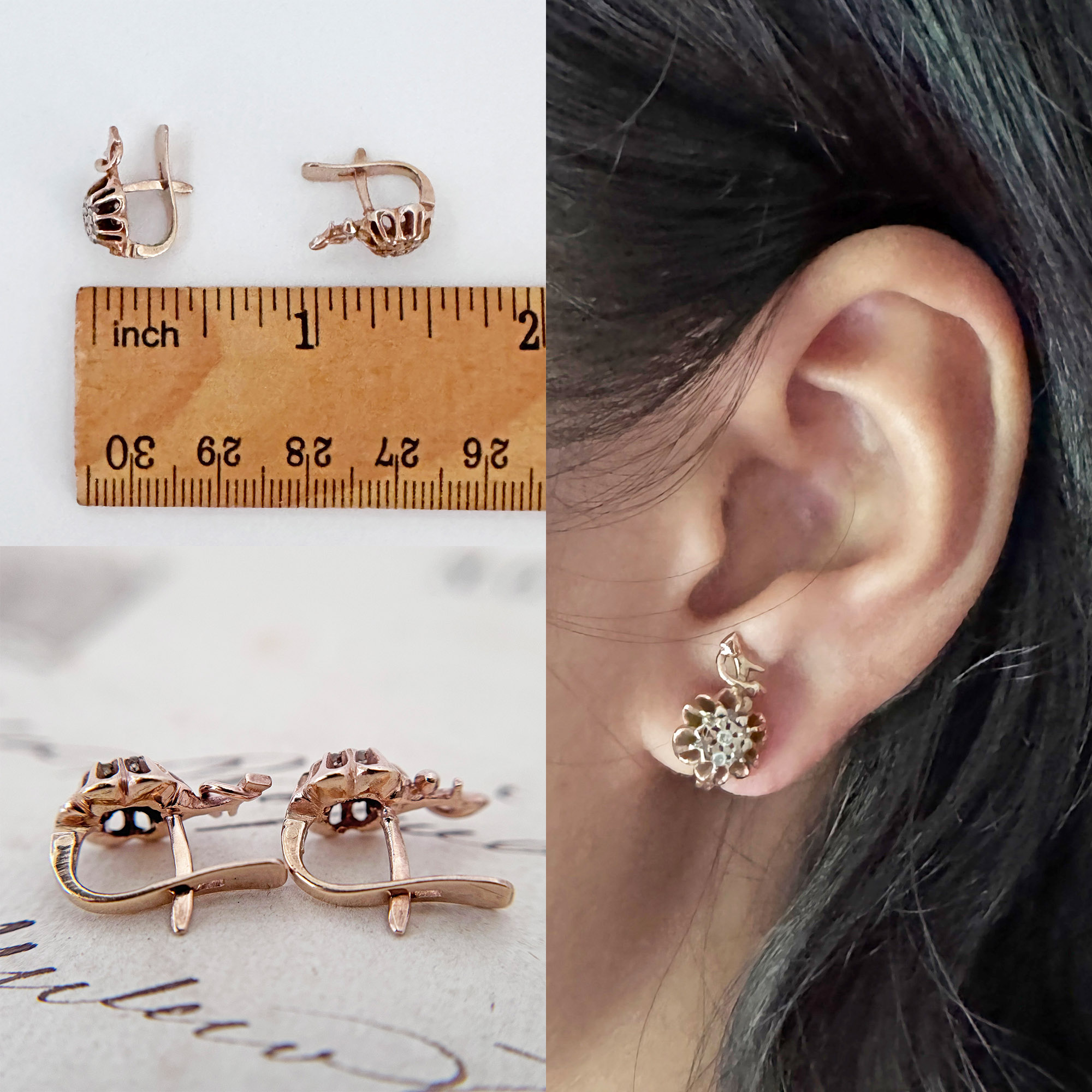 A pair of antique 10K rose gold flower earrings from the Philippines. It has 14 pieces single cut diamonds with inclusions. It’s been gently cleaned and in good condition.