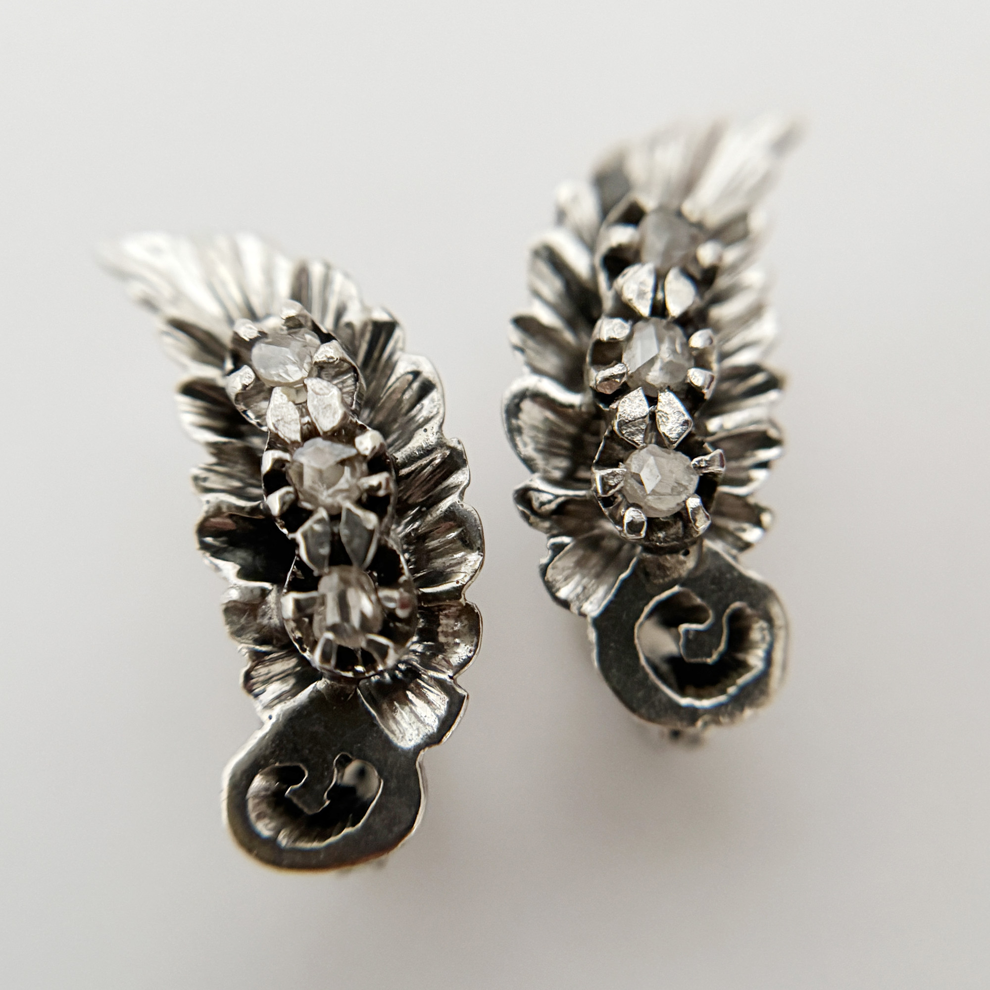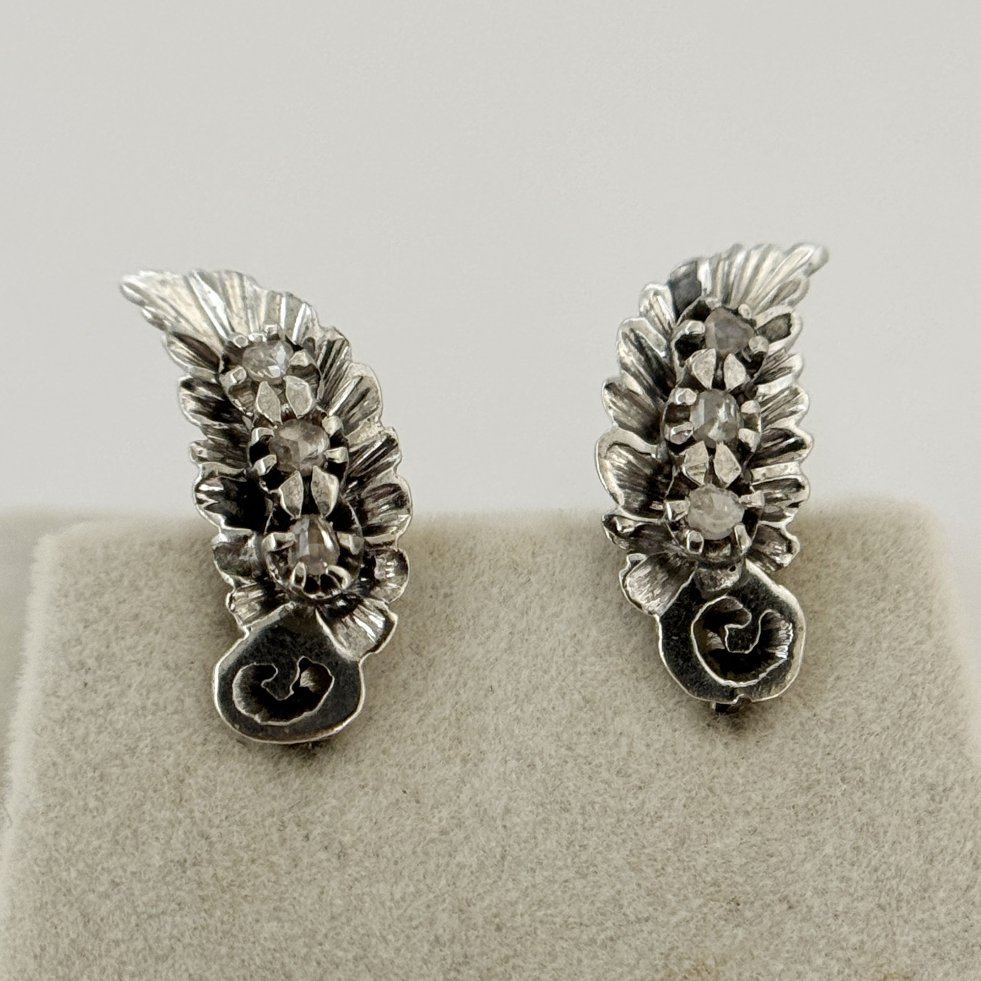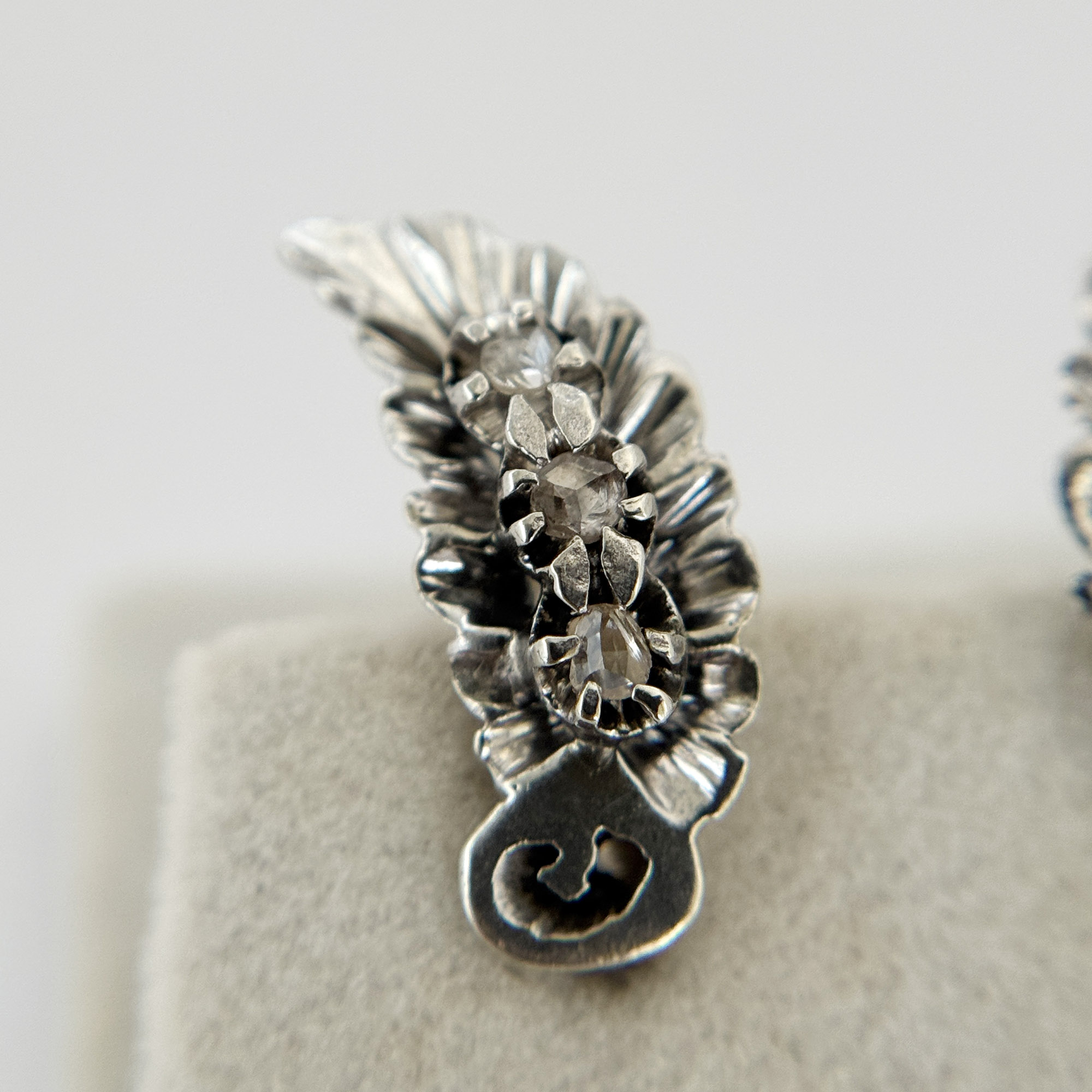 A pair of antique 8K white gold feather shaped earrings from the Philippines. It has latch back locks and has a total of 6 rough cut diamante diamonds. These highly included diamonds were popular in old Filipino jewelry and are considered lucky. Some say they bring luck to a business especially when given as gifts.