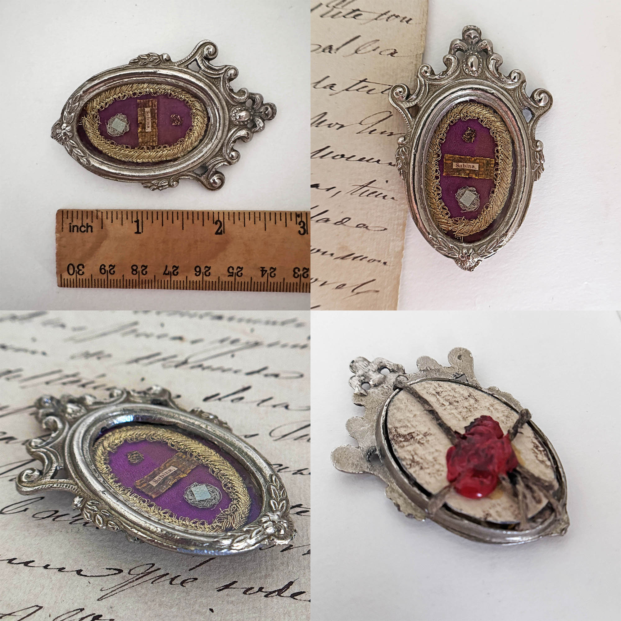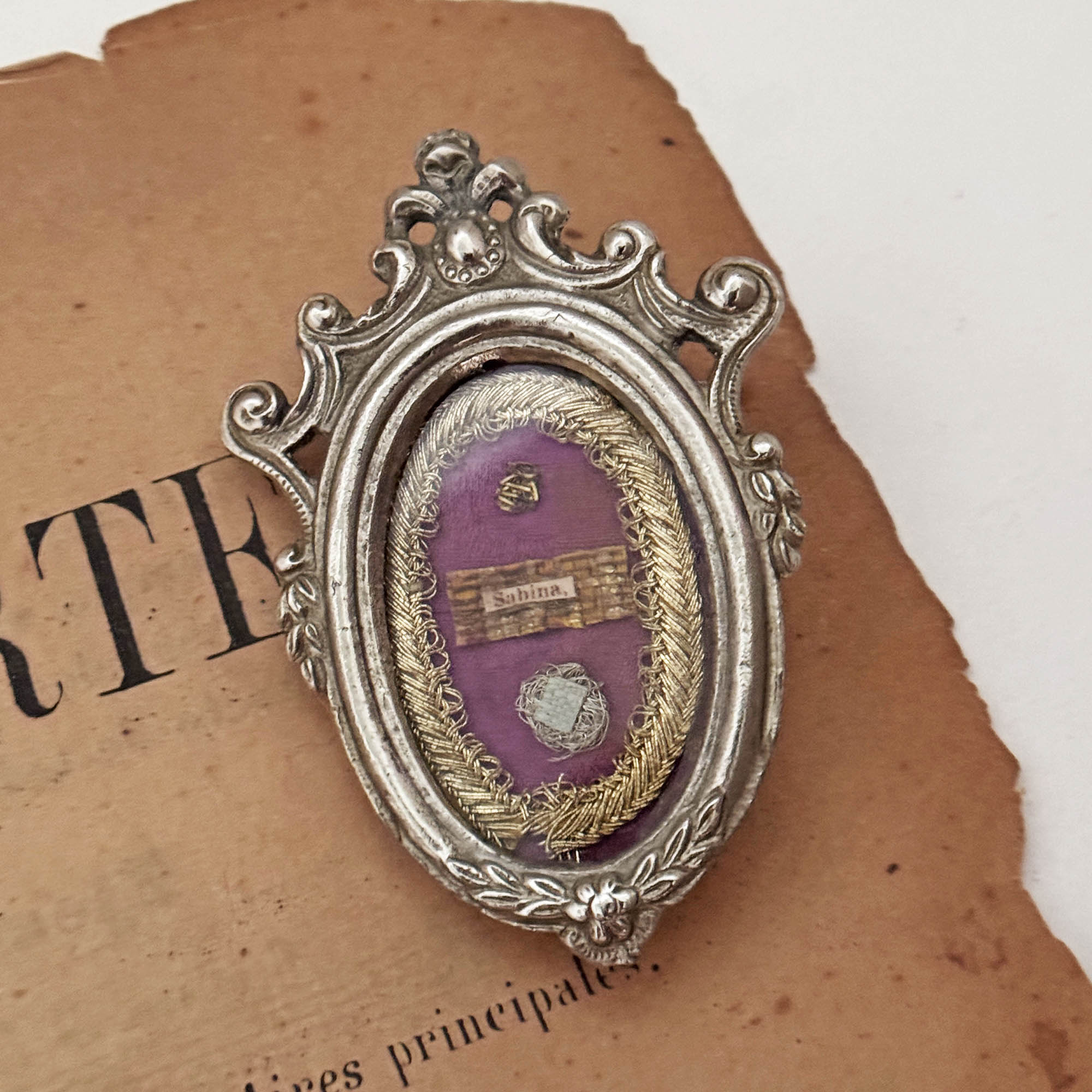 An antique ornately framed relicario made of base metal in silver tone. This is not a pendant but a reliquary case with a holy relic of St. Sabina. It features a gold cord, red fabric with the name “Sabina” in the middle.