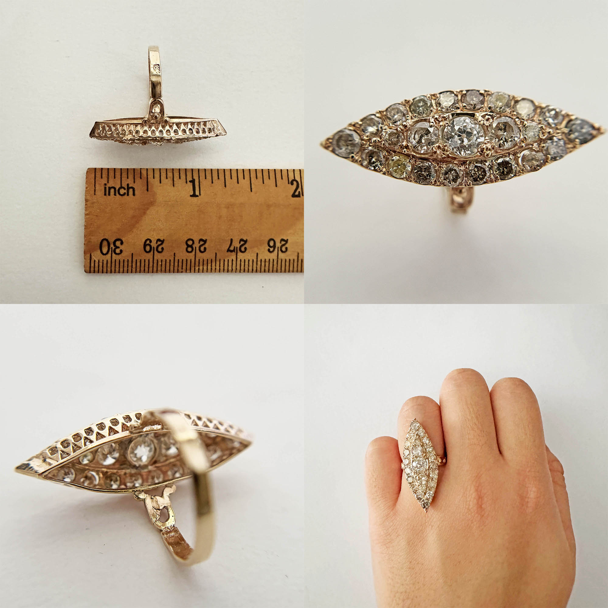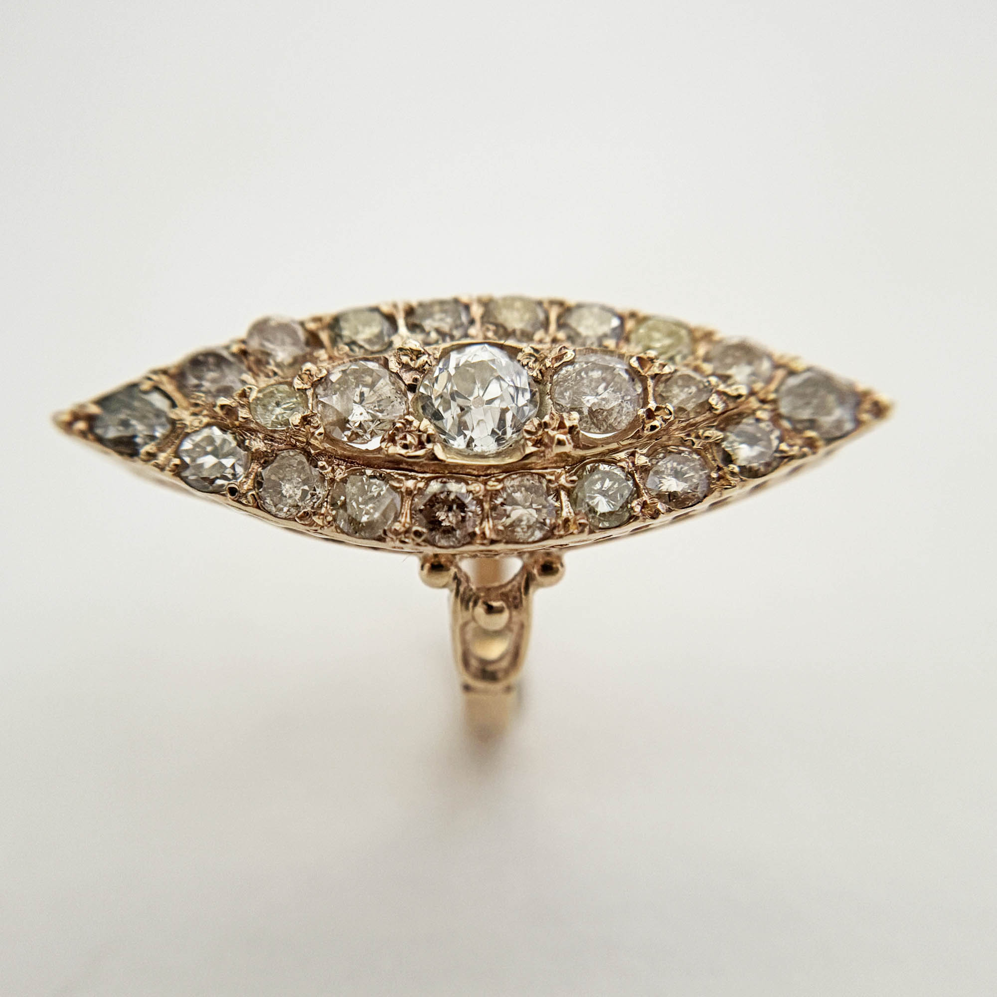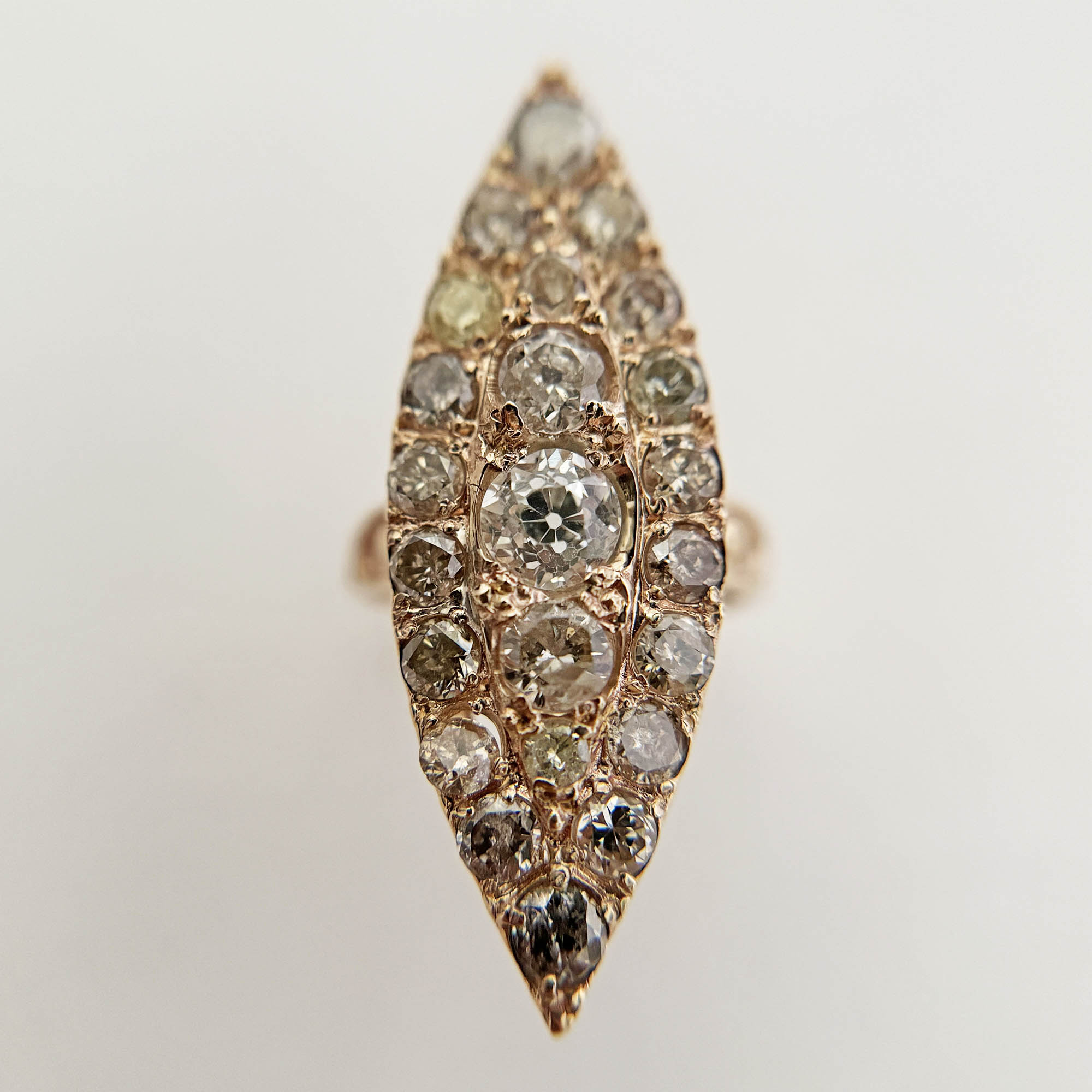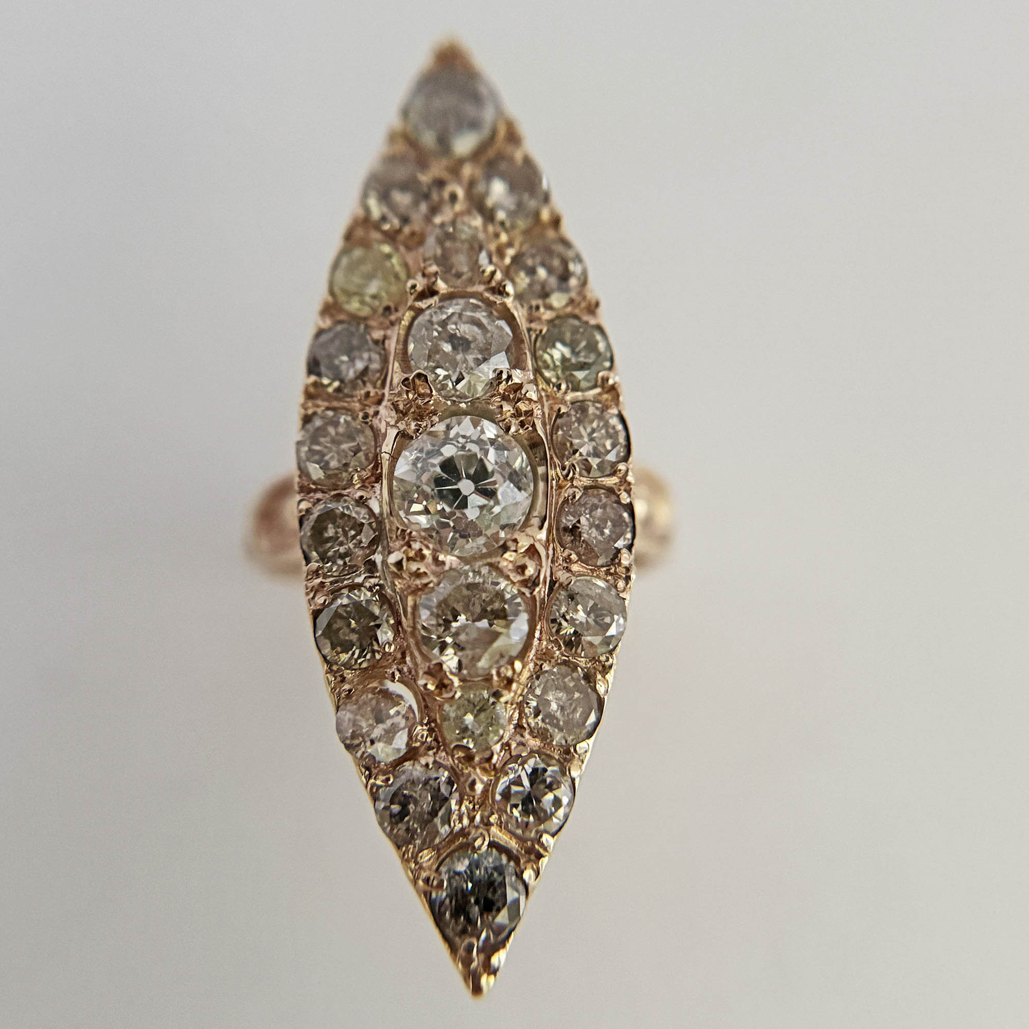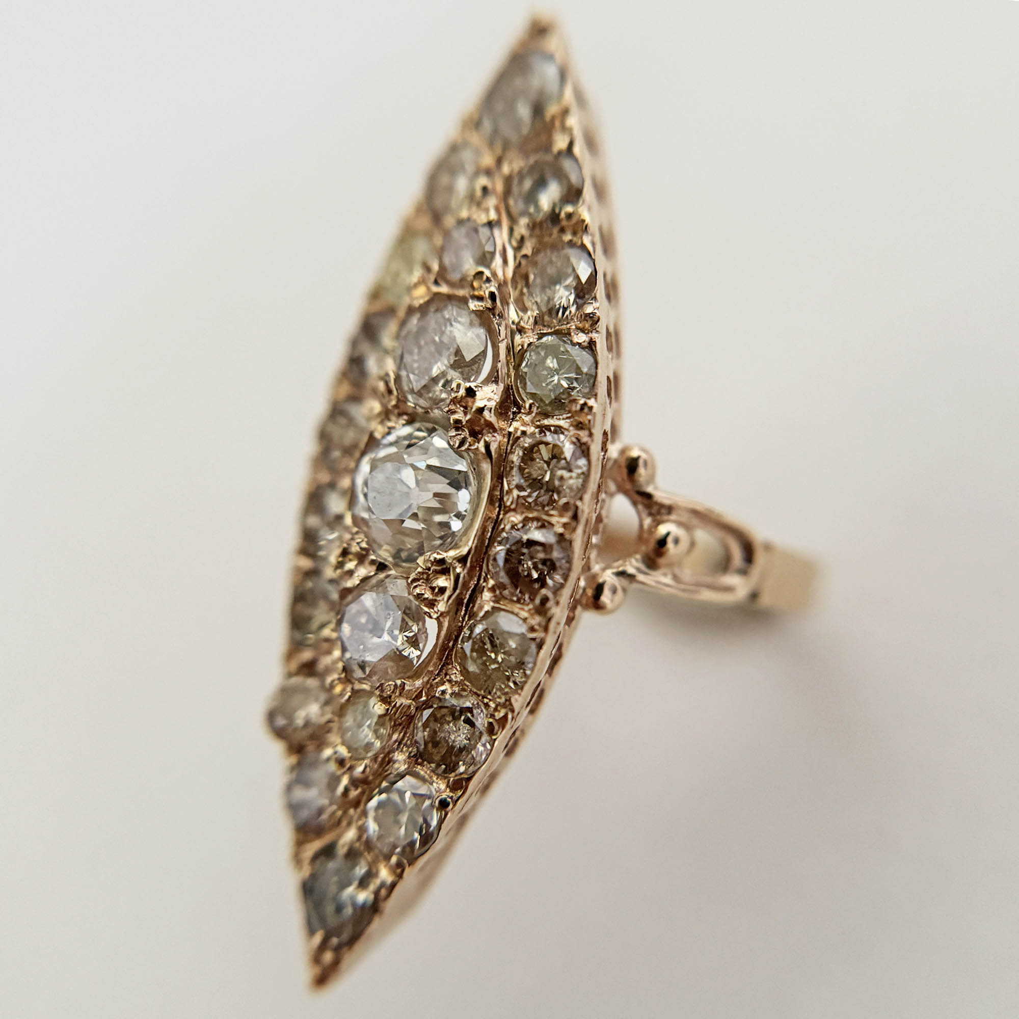 A stunning antique 12K gold lansadera ring studded with diamonds from the Philippines. There are a total of 23 old included diamonds in varying shades of white, yellow and gray. A big 0.40ct European cut diamond sits on the center of the ring.