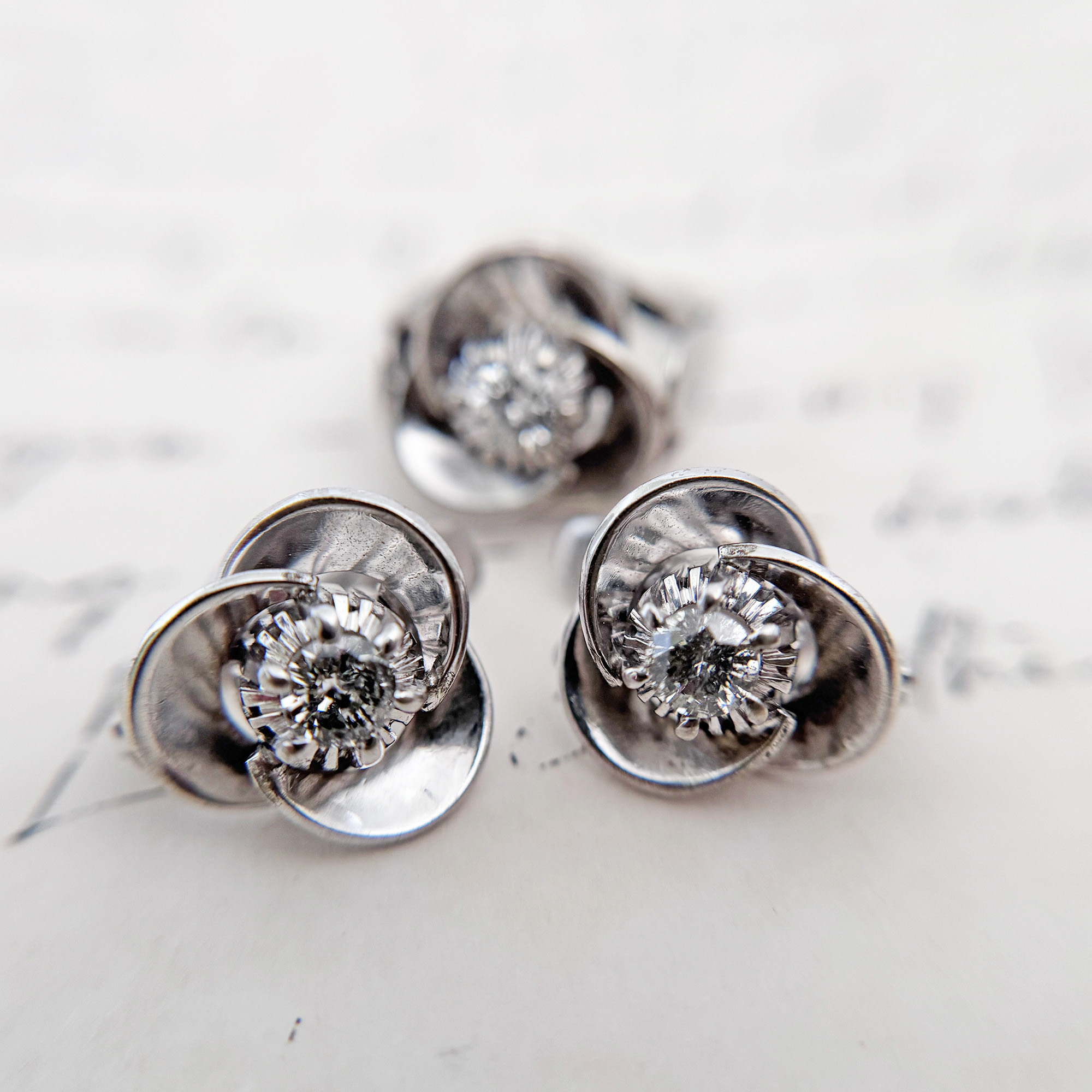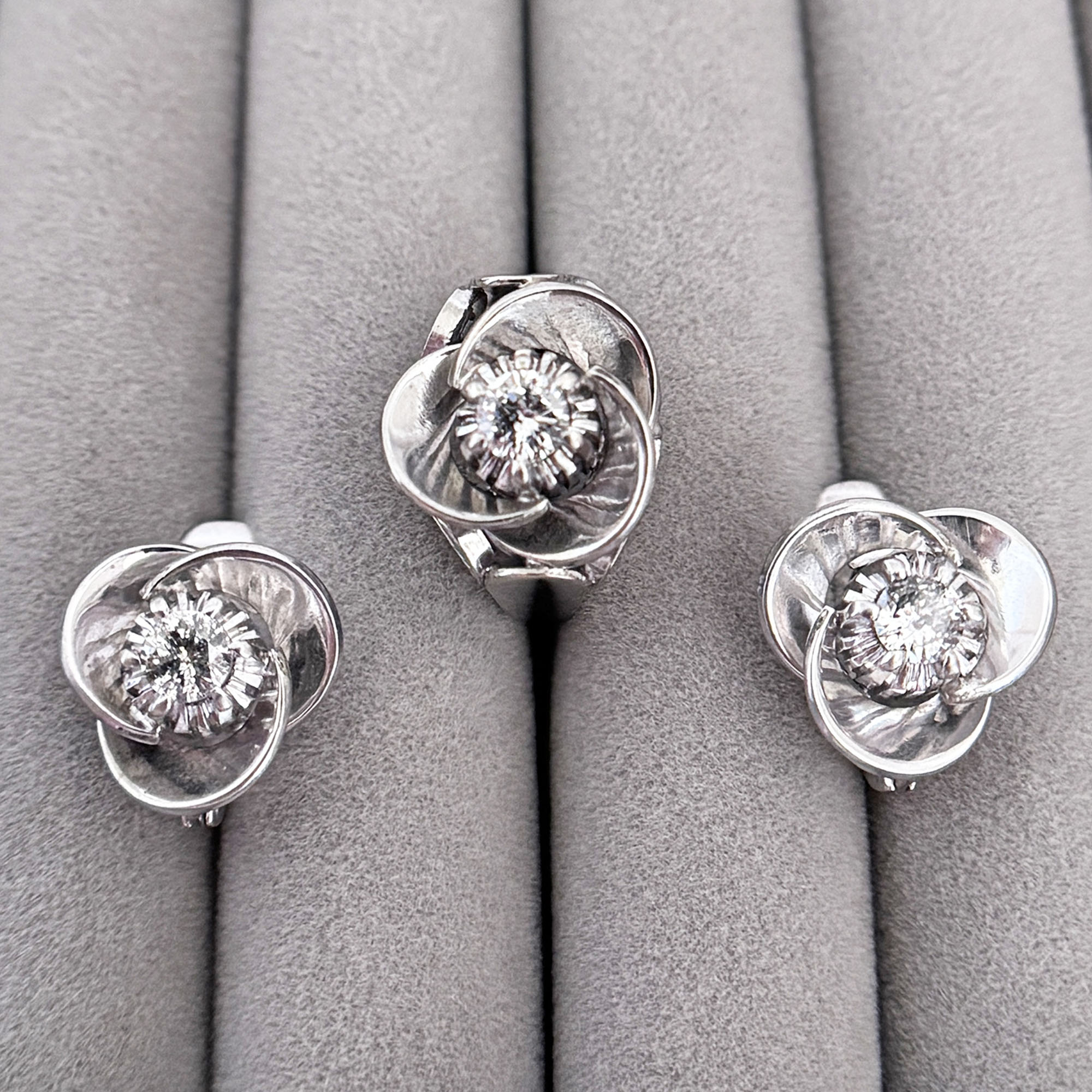A set of big vintage 8K white gold roses earrings and ring set. It has a total of 3 diamonds, quite big at 0.25ct each. The diamonds have carbon inclusions typical of old stones but are sparkly. We couldn’t quite capture on photos how pretty this set is in real life. It’s been cleaned and in good vintage condition.