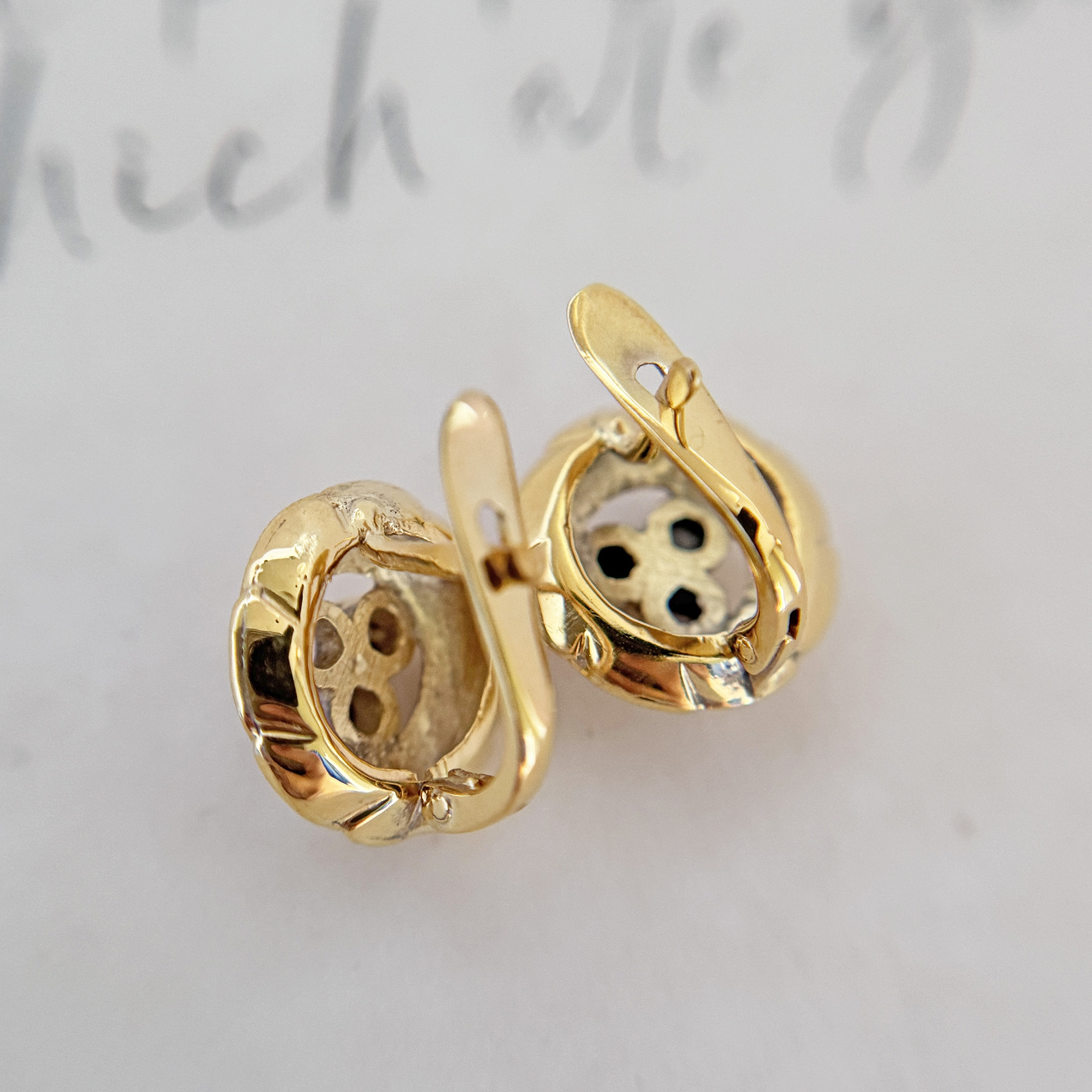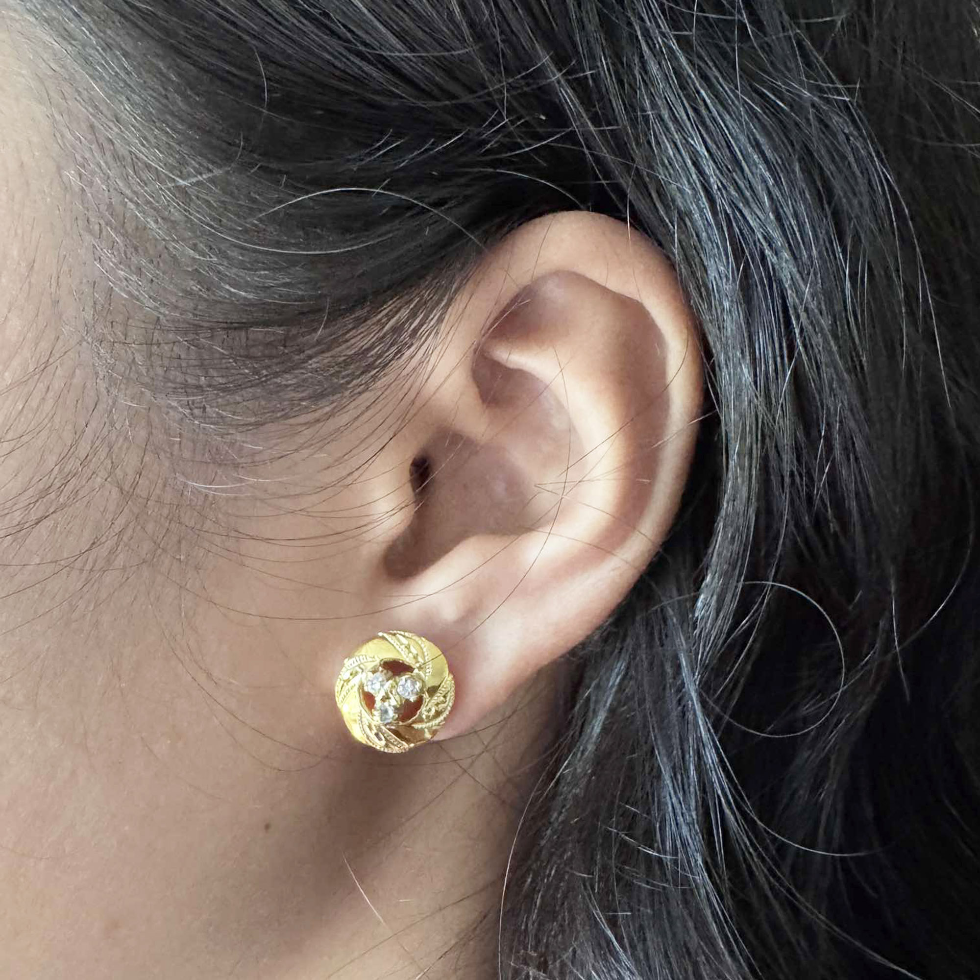 A small vintage 8K gold round earrings from the Philippines. It has 5 pieces rough cut included diamonds which fall under the lucky “diamante” category. There’s also one glass stone which was most likely a replacement. It’s been professionally cleaned and in good vintage condition.