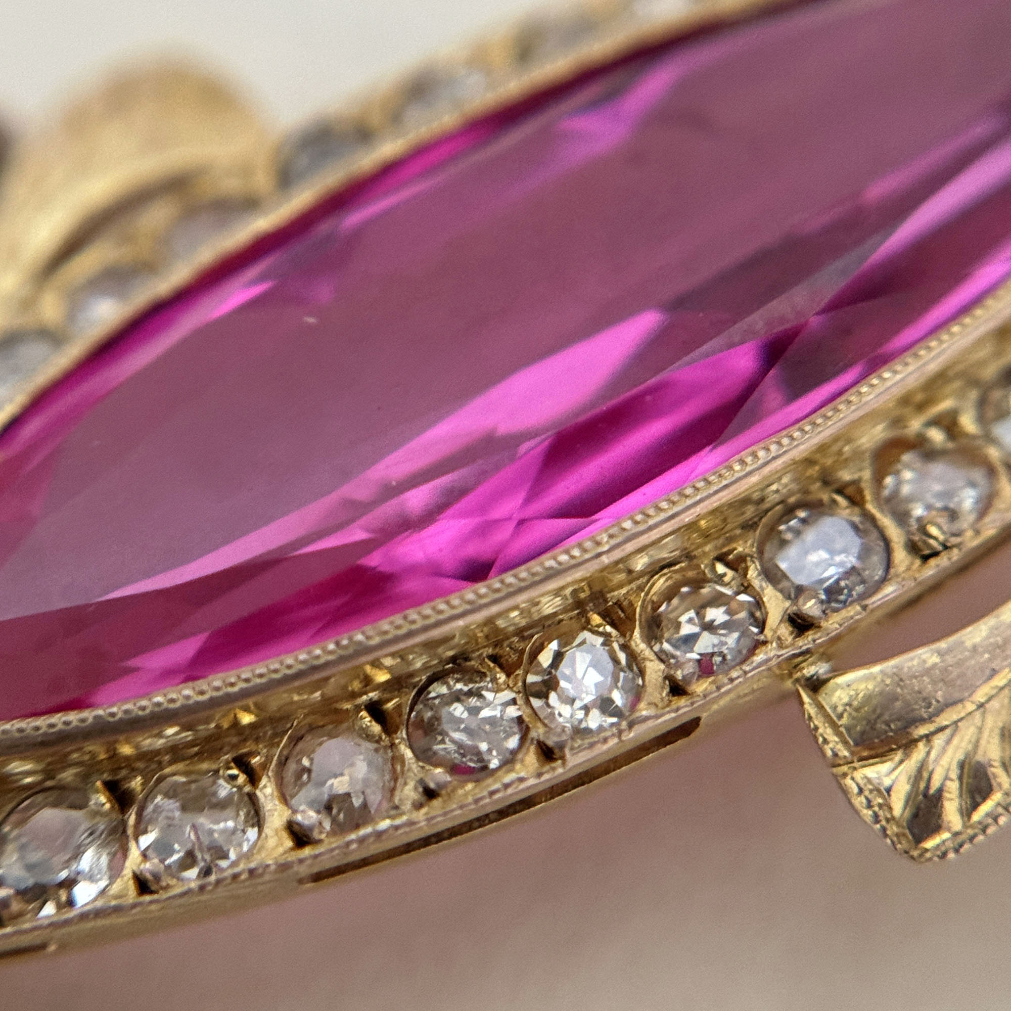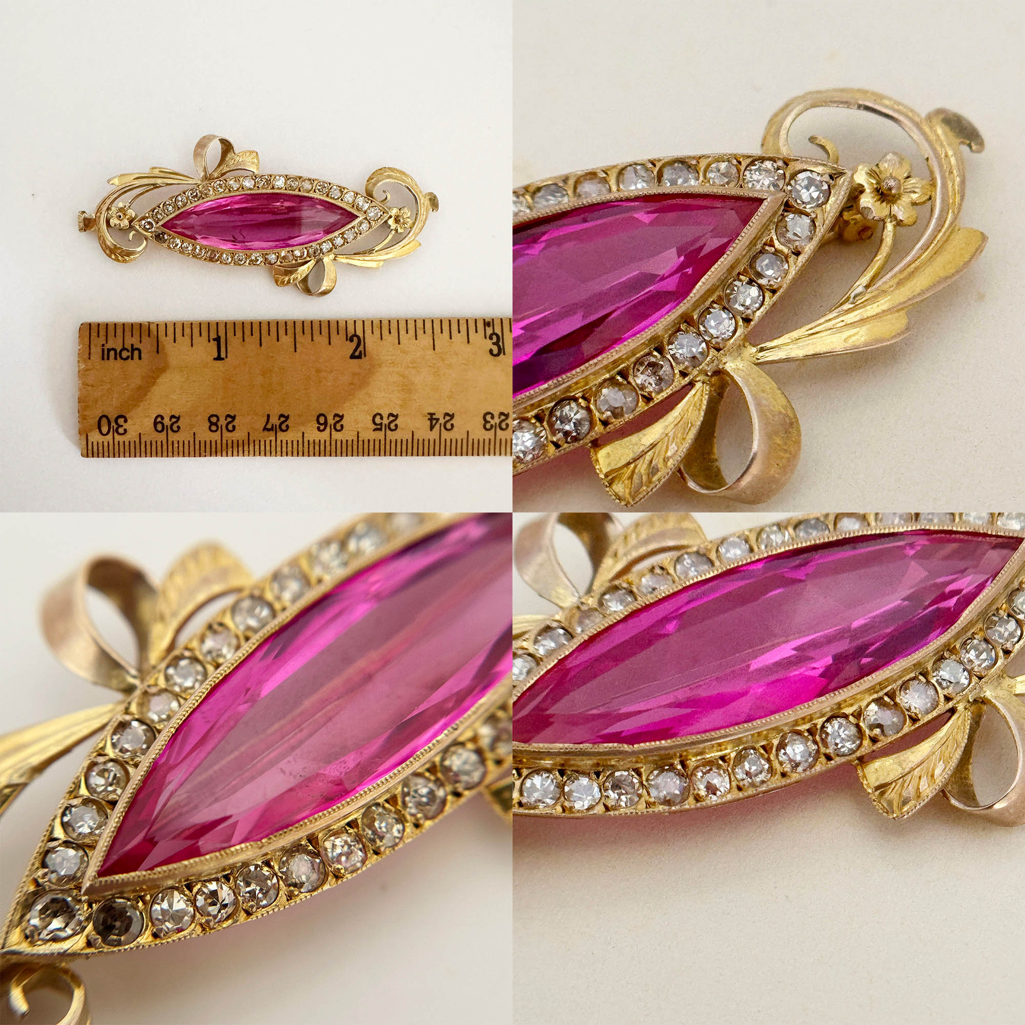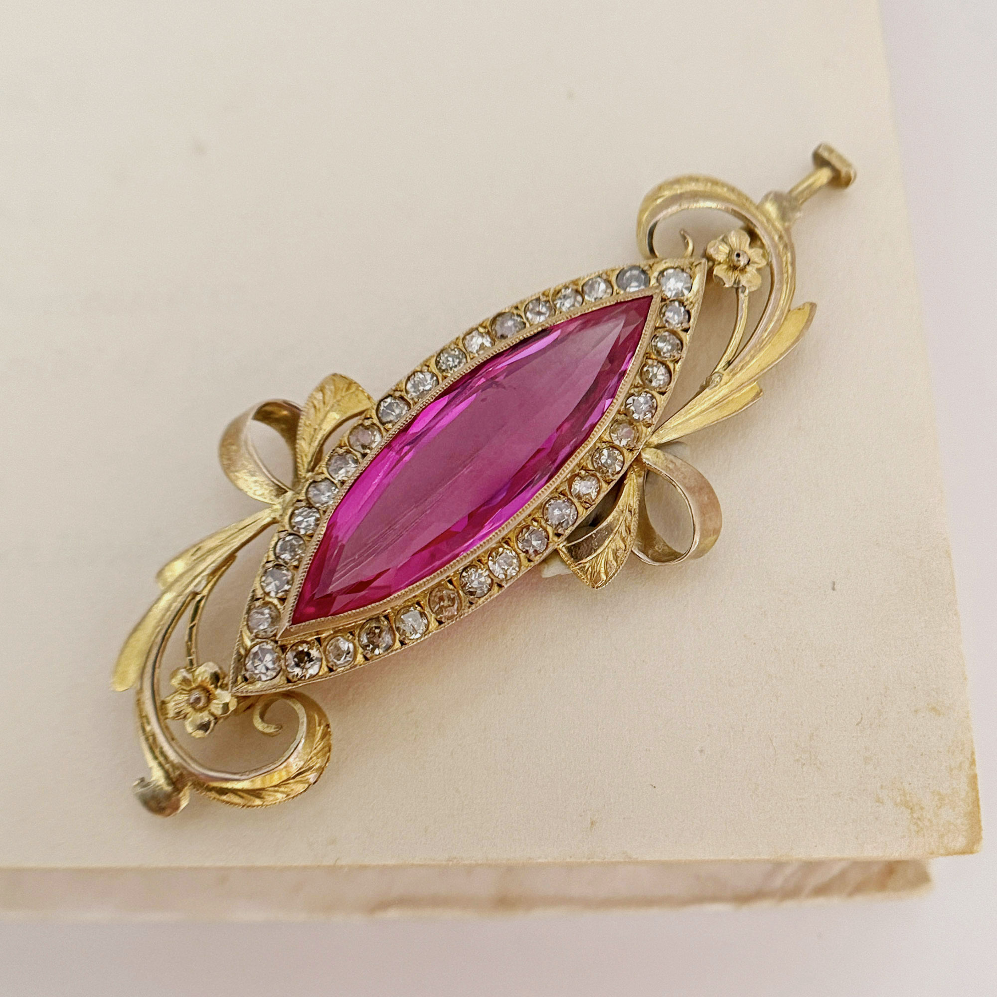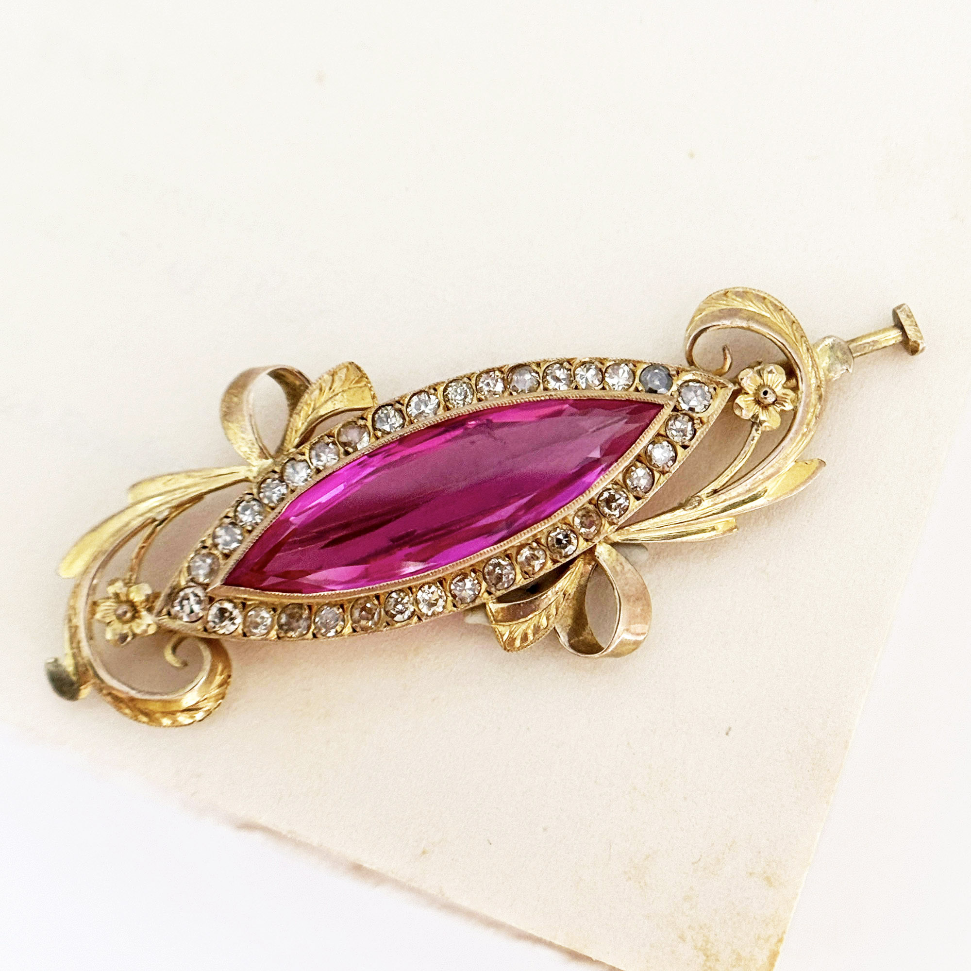Brooches are back! A big vintage 10K gold pink ruby brooch with old diamonds. This eye-catching retro brooch is set on 10K gold. It features a vivid pink lab grown ruby surrounded with small natural old cut diamonds in varying shades typical of old stones. It also has a trombone clasp lock. Both lab grown rubies and trombone clasp locks have been in production since the late 19th century. This piece could be from the late 19th to mid 20th century. It’s been gently cleaned and in good vintage condition.