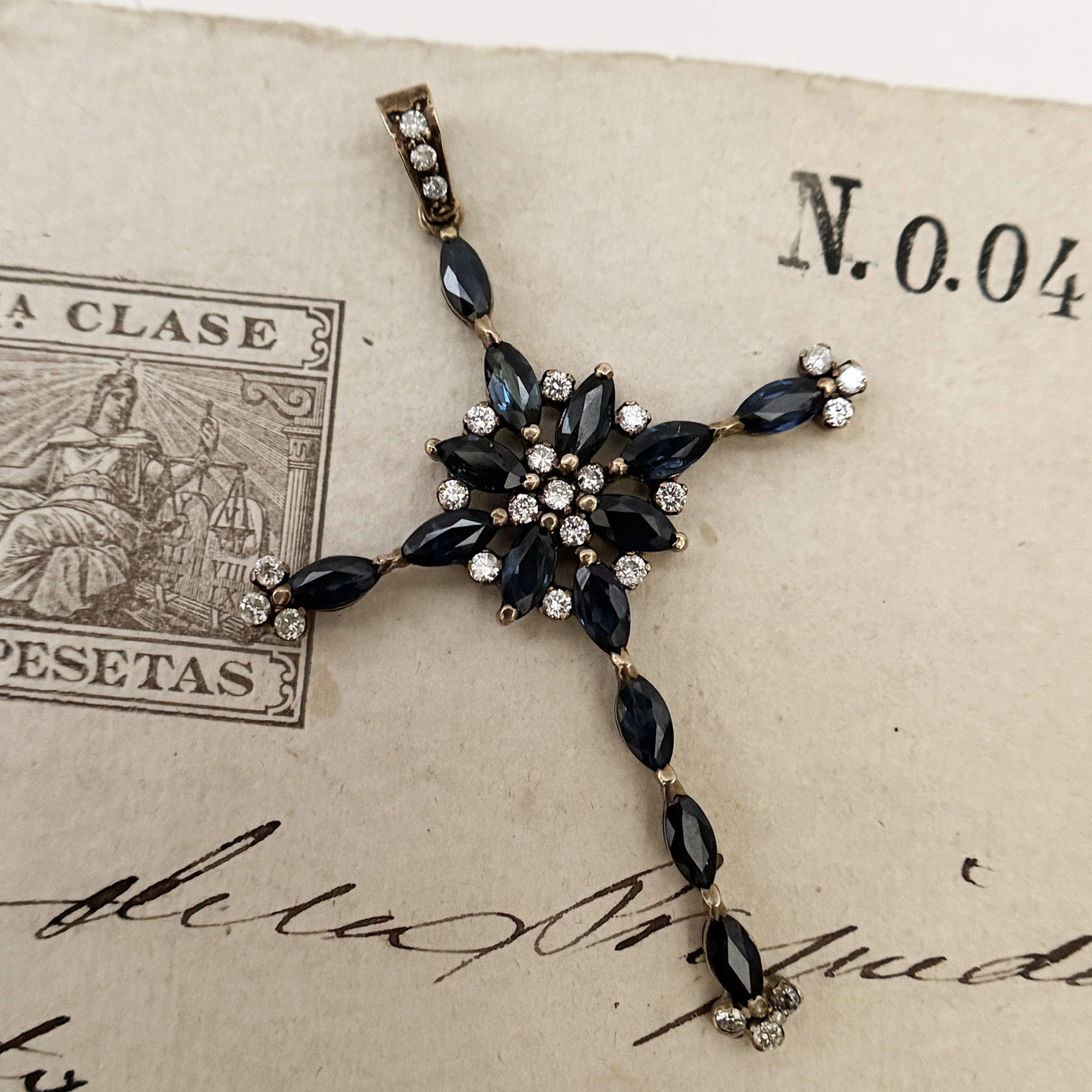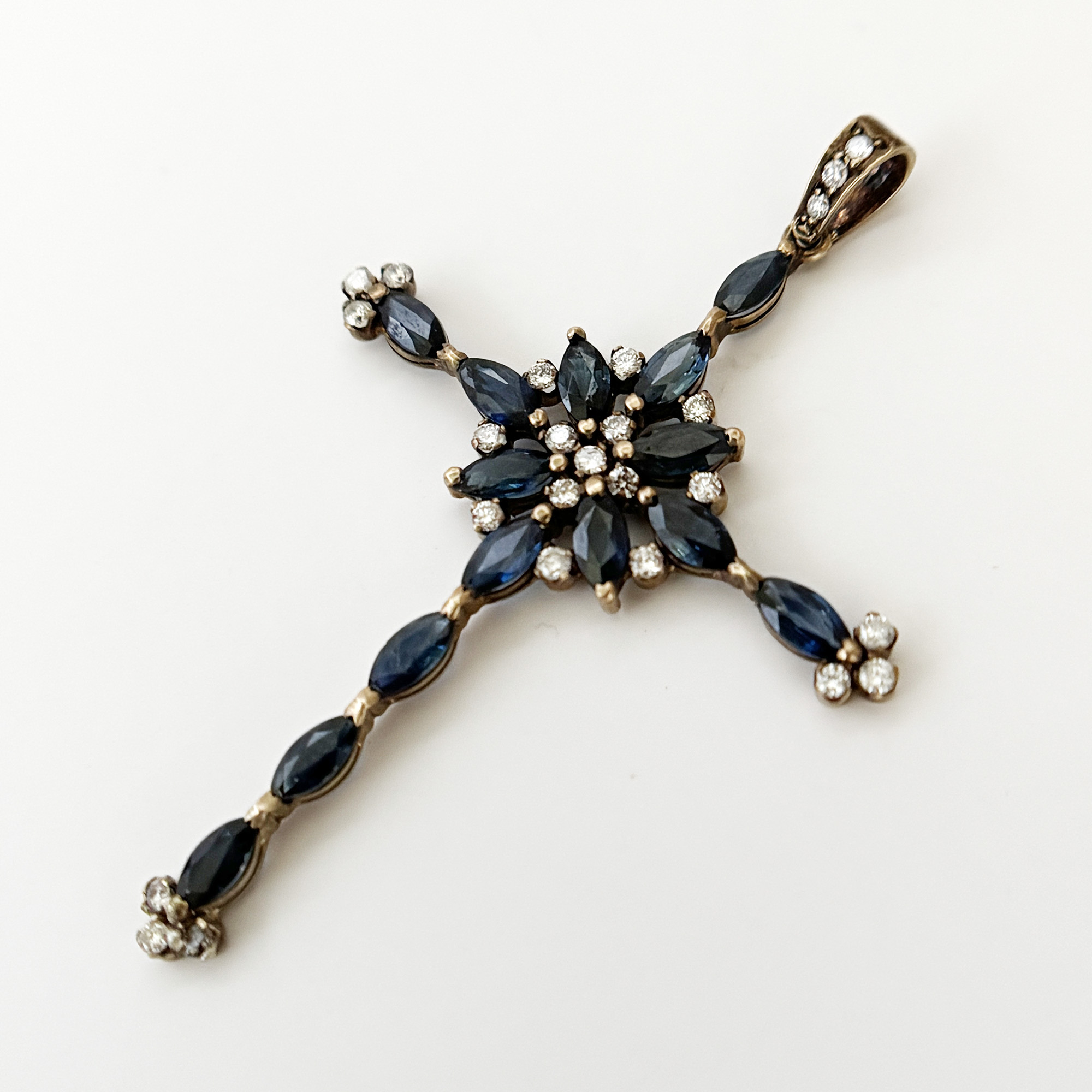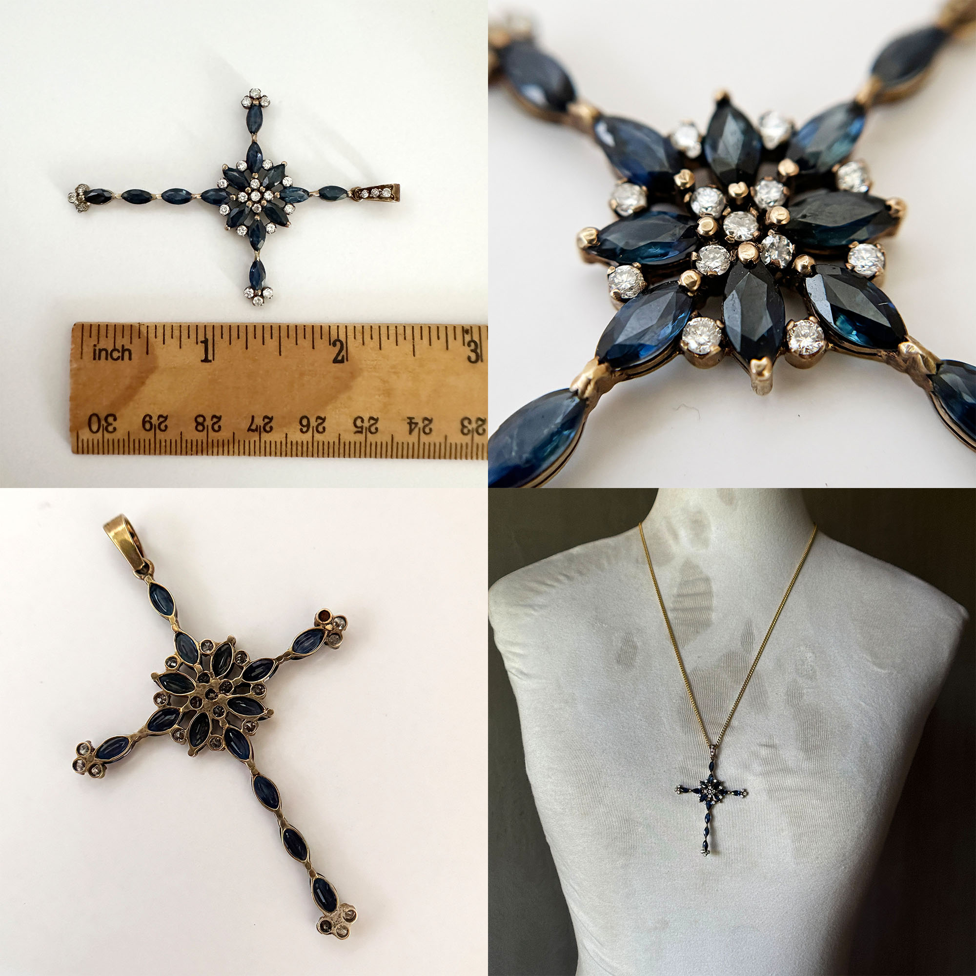 A big vintage 12K rose gold cross pendant with blue sapphires and diamonds. This most likely originated outside the Philippines. The blue sapphires contain rutile silk- these are needle like crystals, making it a strong indicator that they are natural. One small diamond stone was replaced at the end the cross and the price has been adjusted to reflect that but overall in good vintage condition.