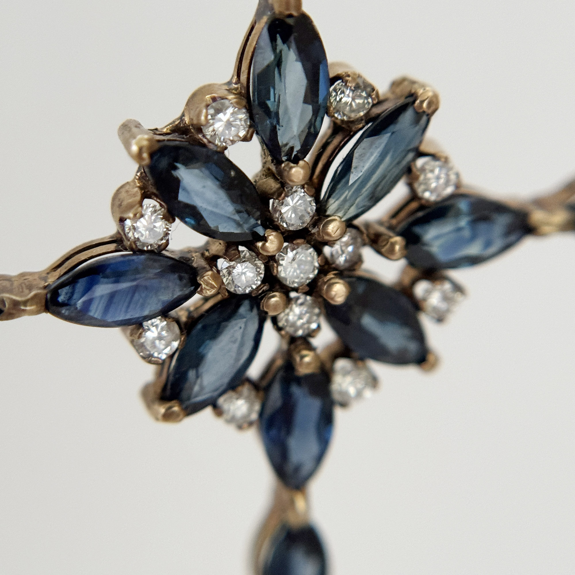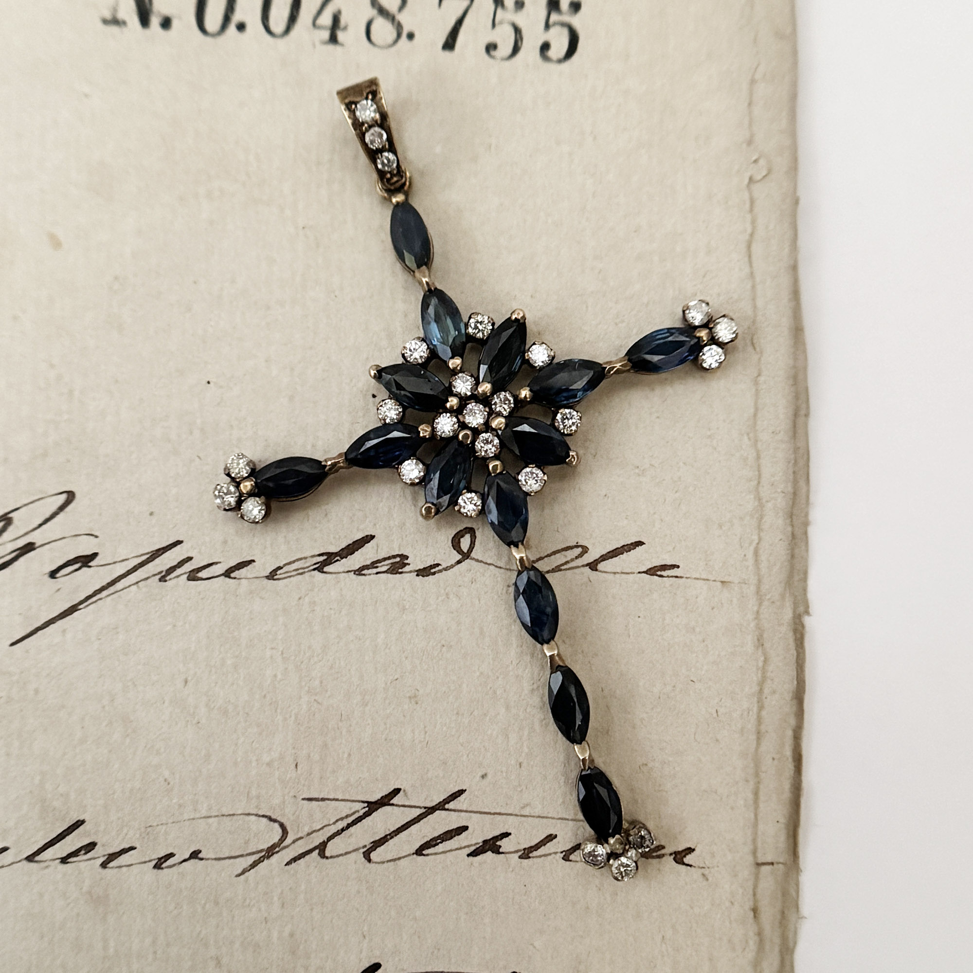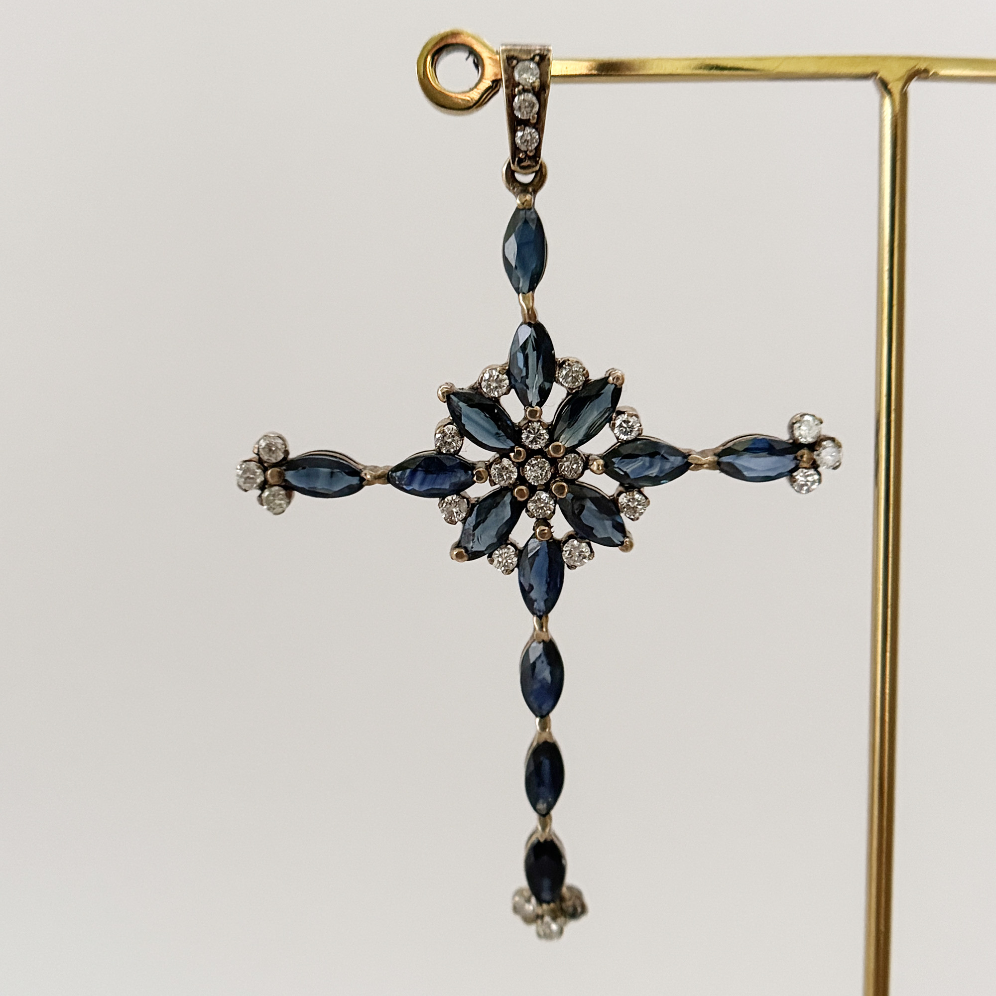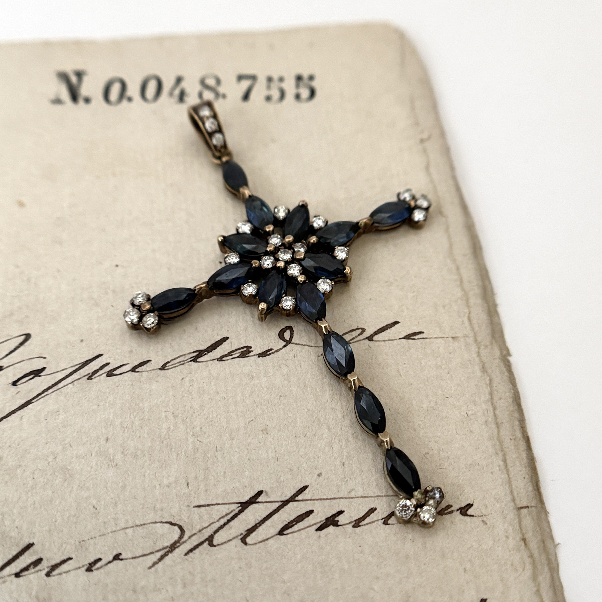 A big vintage 12K rose gold cross pendant with blue sapphires and diamonds. This most likely originated outside the Philippines. The blue sapphires contain rutile silk- these are needle like crystals, making it a strong indicator that they are natural. One small diamond stone was replaced at the end the cross and the price has been adjusted to reflect that but overall in good vintage condition.