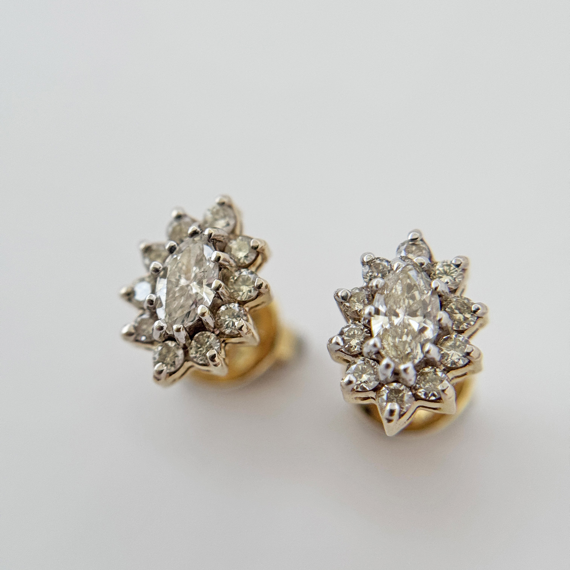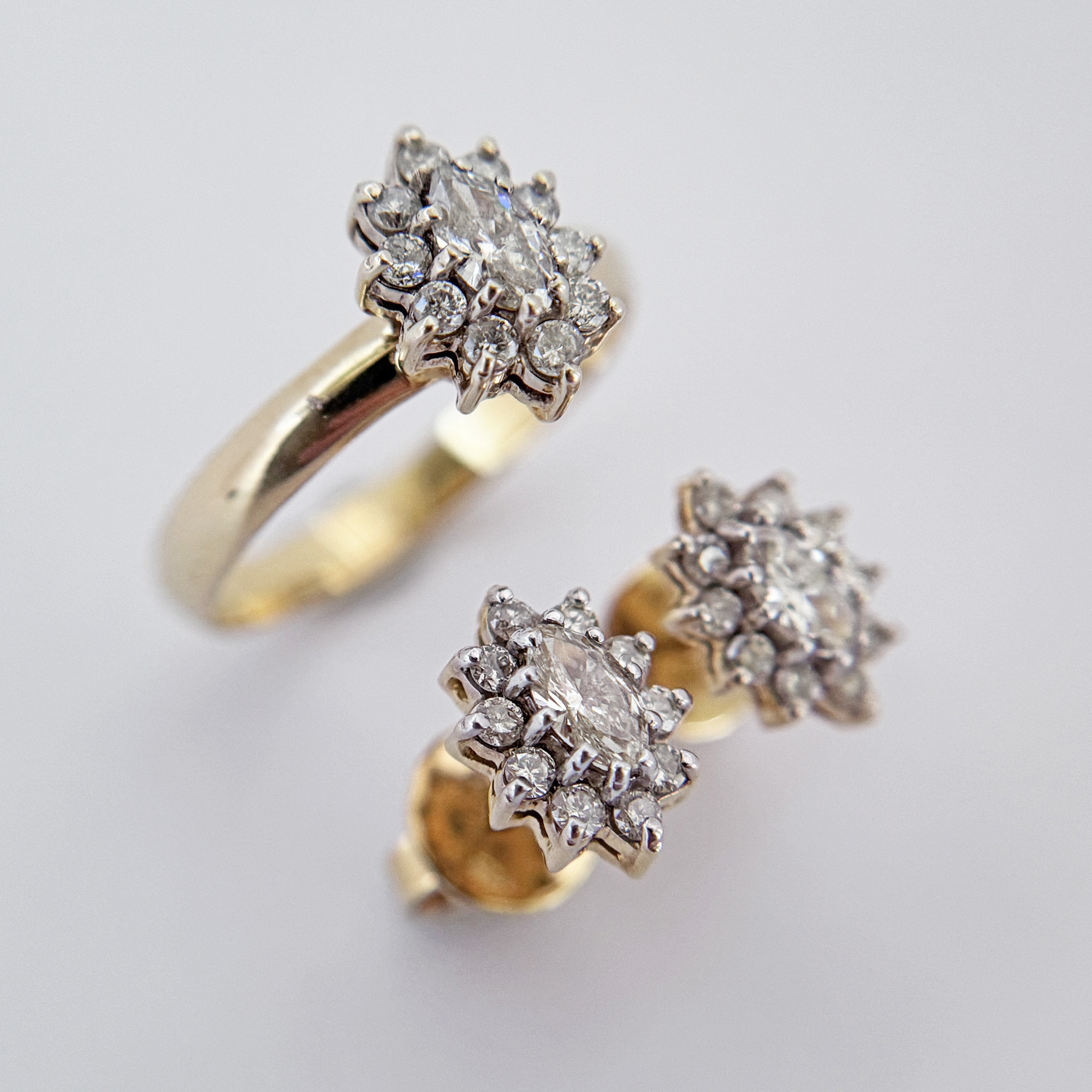 A set of vintage 14K gold earrings and ring set from the Philippines. It has 3 pieces marquise cut diamonds and are surrounded by small brilliant cut diamonds. There are some inclusions but very sparkly. It’s been gently cleaned and in good vintage condition.