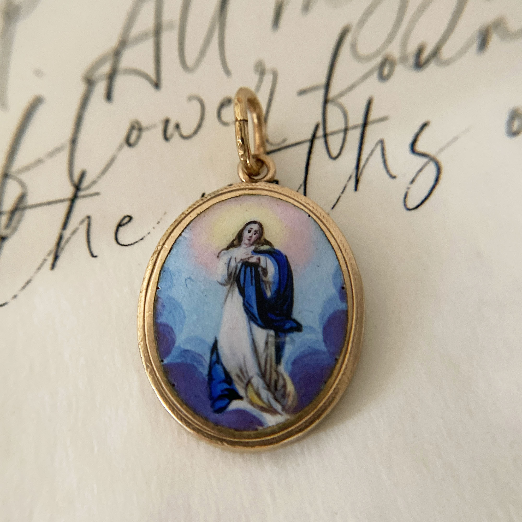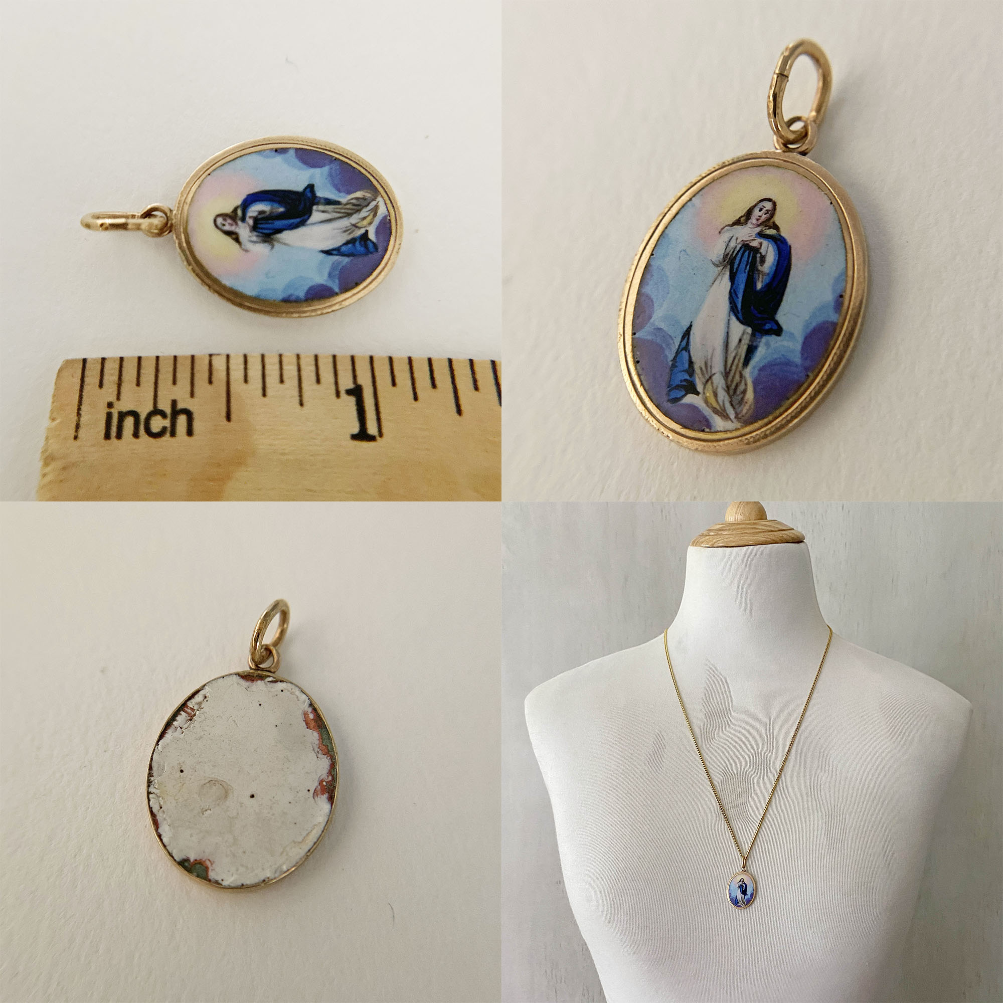 A vintage 14K gold enamel or “esmalte” Mother Mary pendant. This a stamped porcelain. This most likely originated from Europe. If this looks familiar, we had it pulled out and finally found a good platero who was able to cover the back part in 14K gold.