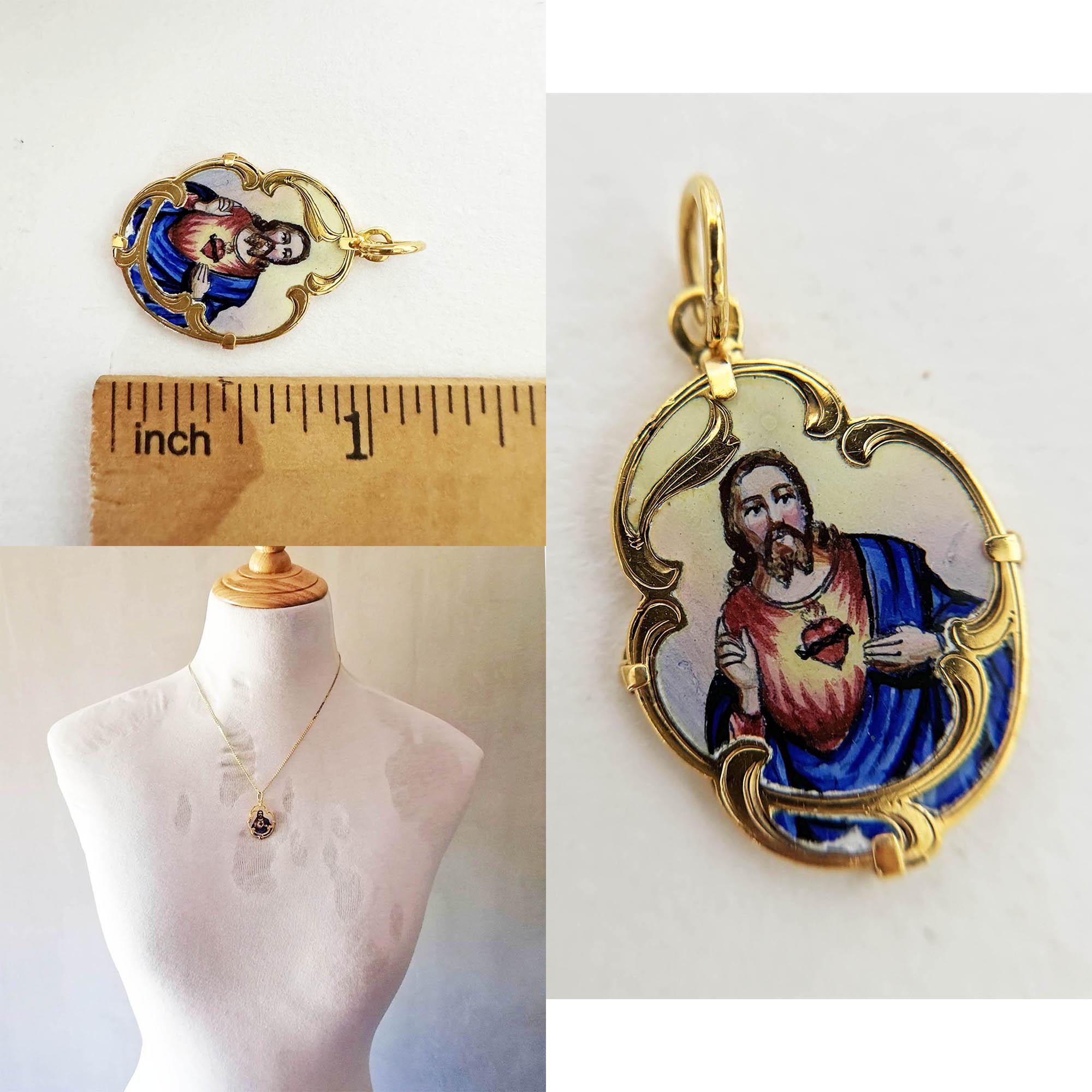 A vintage stamped porcelain enamel or “esmalte” pendant showing the Sacred Heart of Jesus set in 14K gold. The back part says “Corazon de Jesus”.