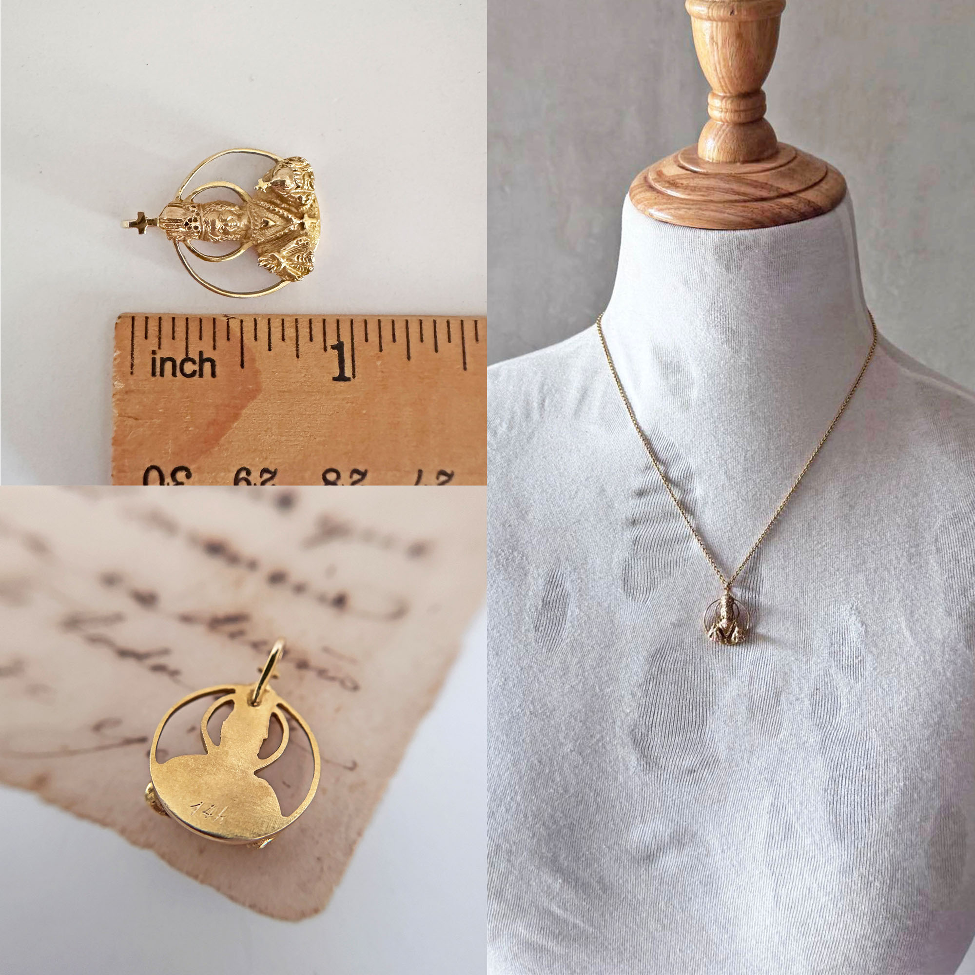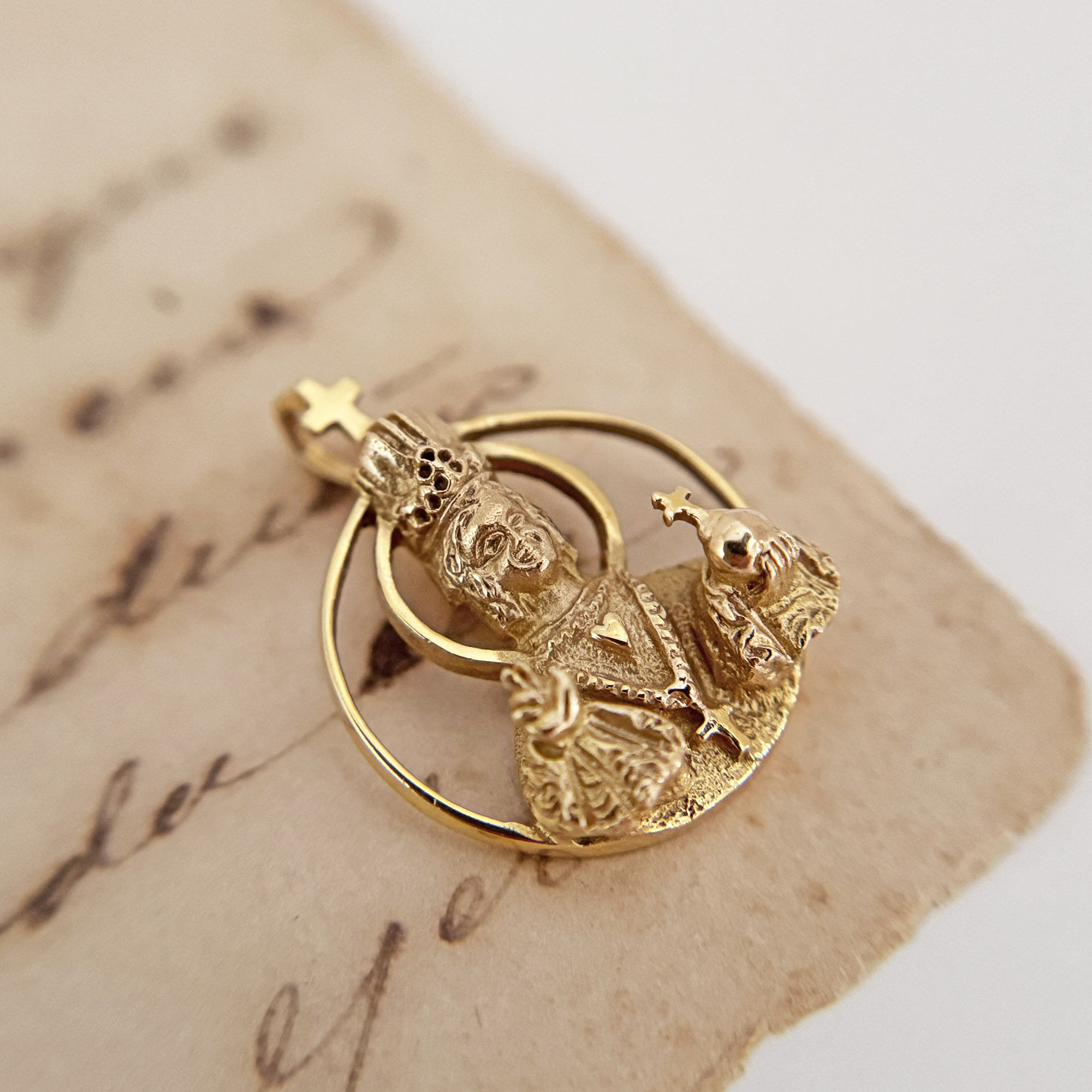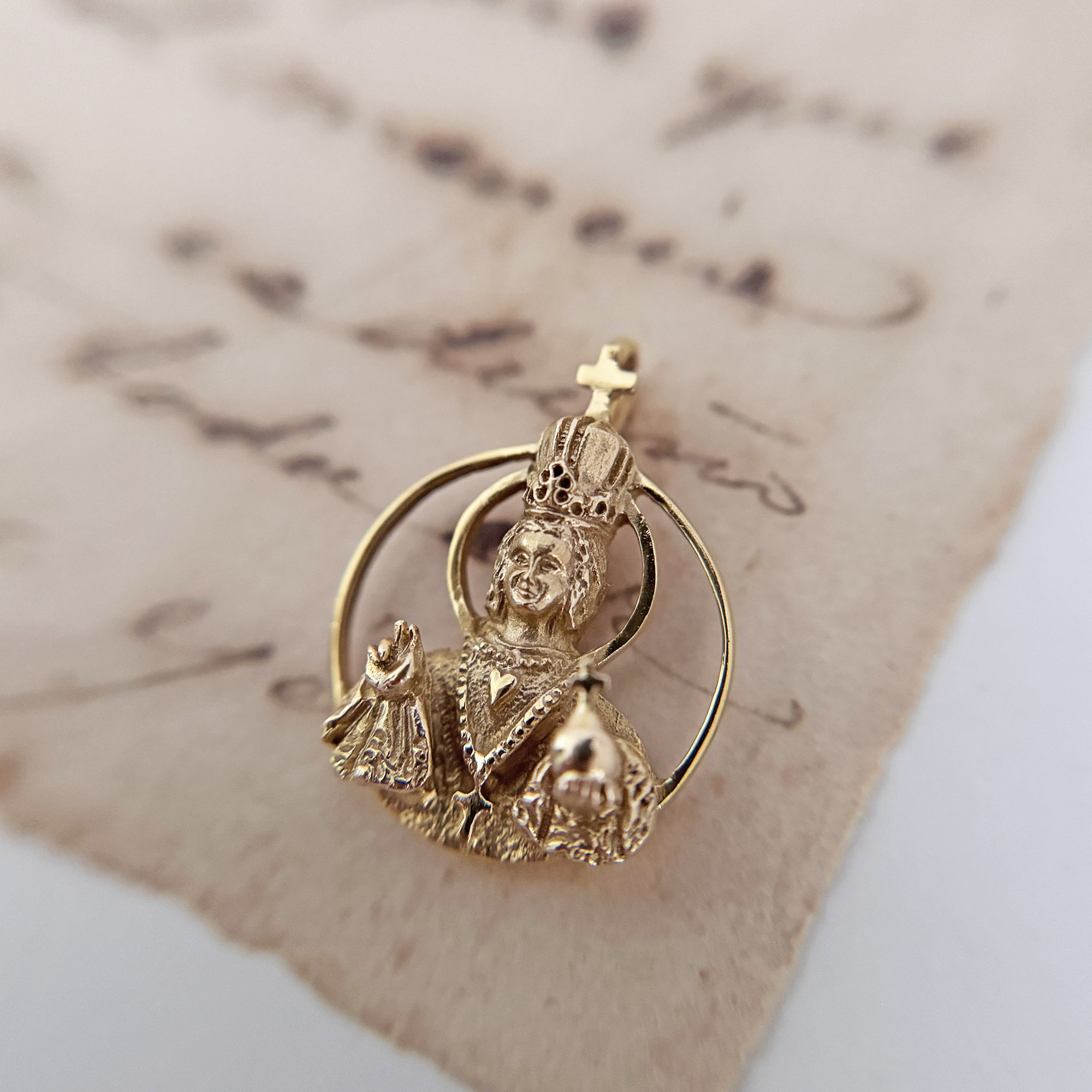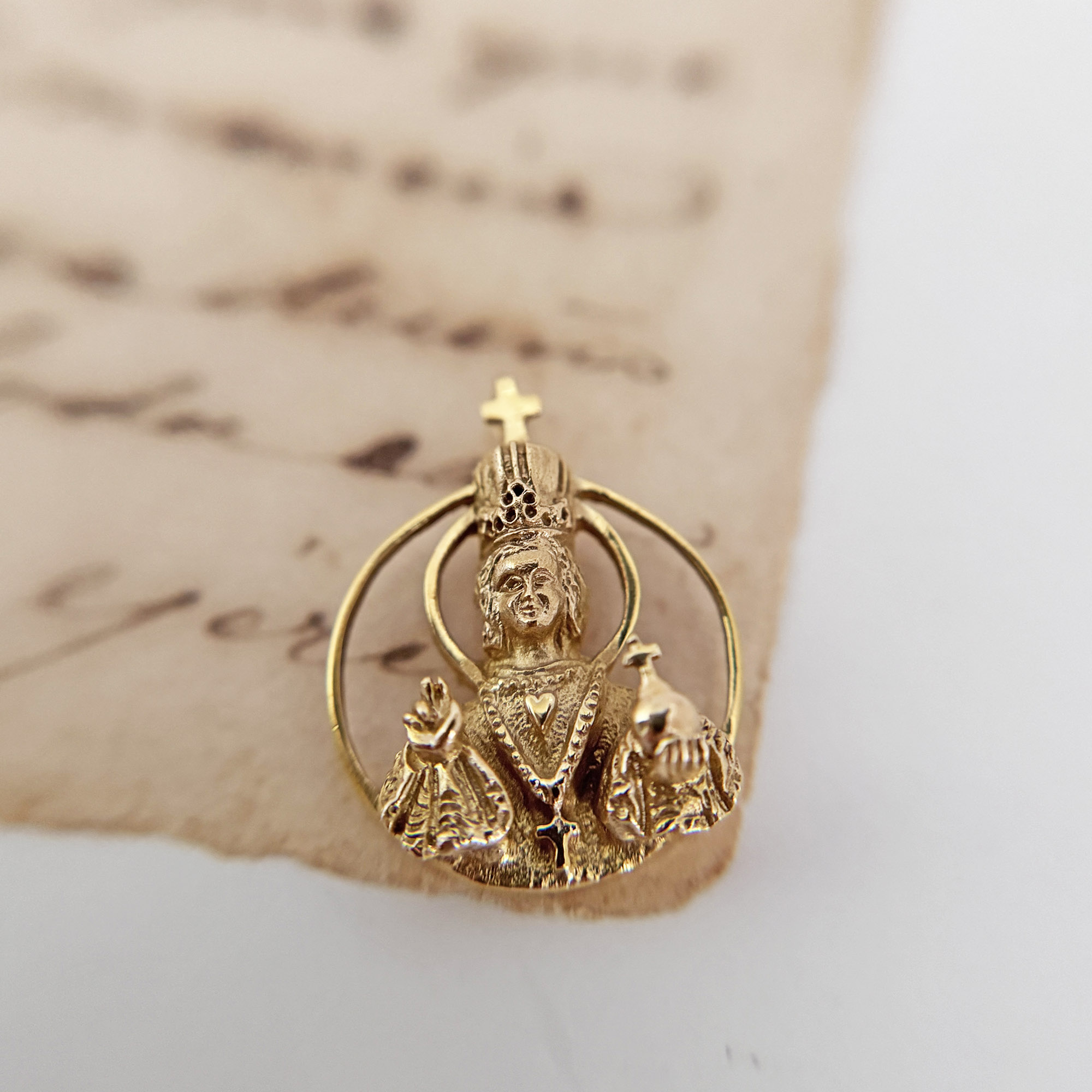 A vintage 14K gold Santo Niño pendant from the Philippines. This is the image of the Holy Child Jesus dressed like a king and holding the globe with a cross on his left hand while raising his right hand in blessing. The Santo Niño is deeply rooted in Filipino culture. It is said that upon arriving in the Philippines in 1521, Ferdinand Magellan presented a Santo Niño image to Rajah Humabon, the chieftain of Cebu and his wife, Hara Amihan as a gift. They were one of the first Christian converts.