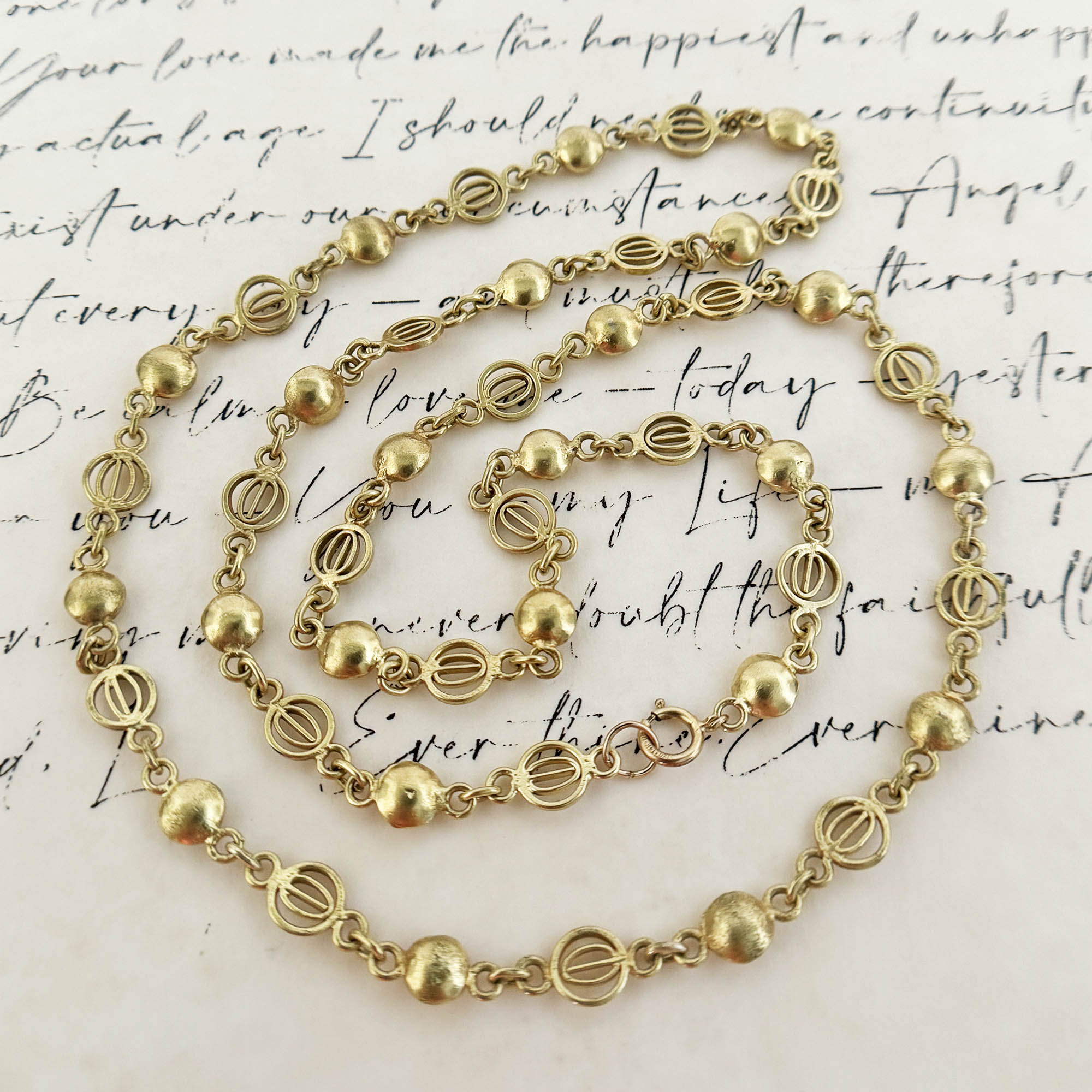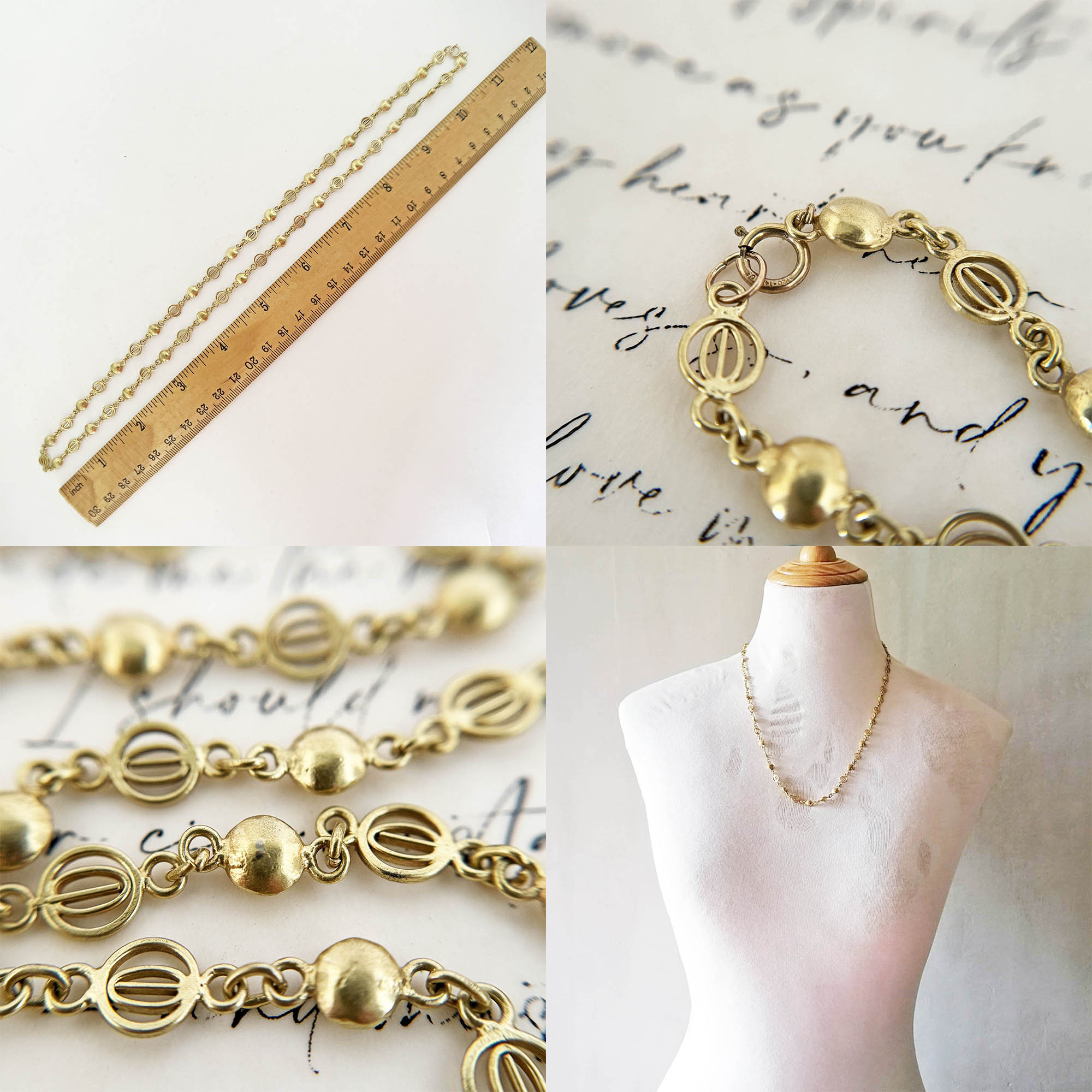 A vintage silver chain in gold-plated finish from the Philippines. This short chain at 22 inches long has a gold-filled lock. It is in its original finish but gently cleaned. It is in good vintage condition with a bit of weight to it.